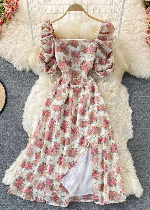 Cute Apricot Square Collar Print Tunic Chiffon Maxi Dresses Short Sleeve