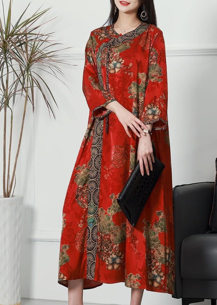 French Red Print Outfit Stand Collar Side Open Art Dress