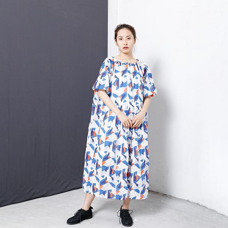 Gradient Color Blue O-Neck Wrinkled Ramie Long Dress Short Sleeve