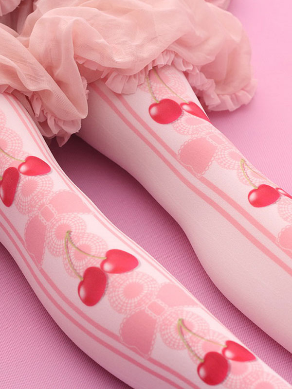 Sweet Lolita Stockings Pink Velvet Cherry Printed Lolita Knee High Socks