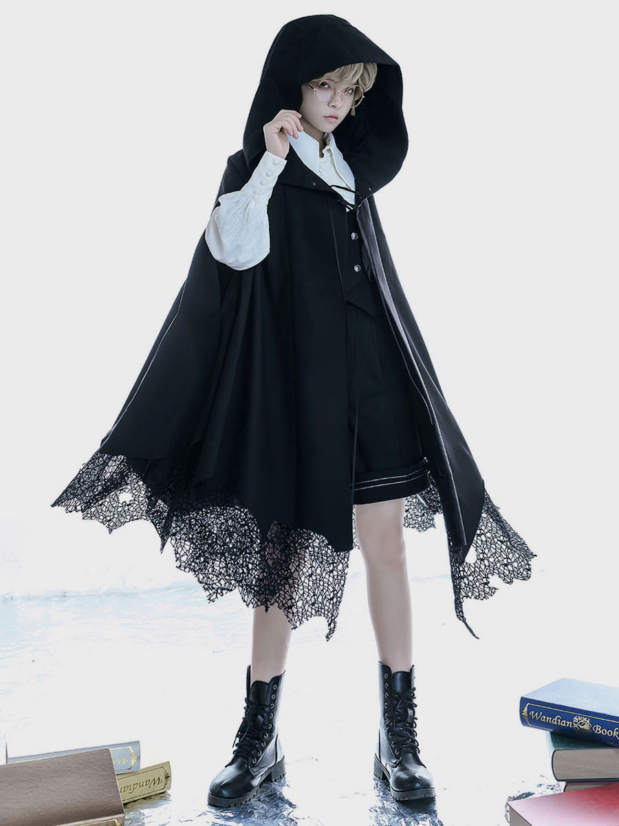 Gothic Lolita Outfits Wool Black Ribbons Hooded Cape With Winter Coat