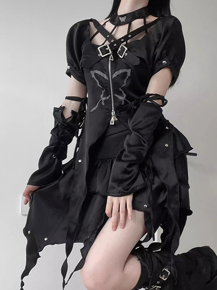 Gothic Lolita Outfits Black Grommets Ruffles butterfly Pattern Short Sleeves Skirt Top