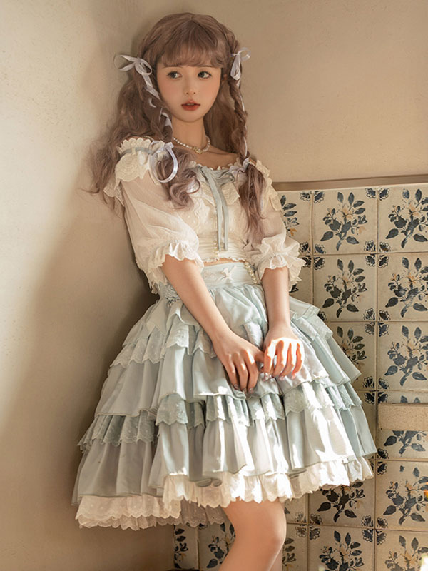 Academic Lolita Outfits Light Sky Blue Ruffles Lace Short Sleeves Skirt Top