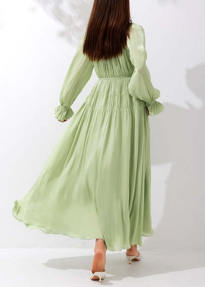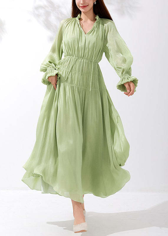 Art Green V Neck Wrinkled Lace Up Silk Maxi Dresses Butterfly Sleeve