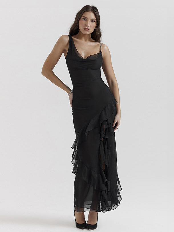 Asymmetrical Tulle Dress Sleeveless Ruffles High-Slit Sexy Maxi Dresses