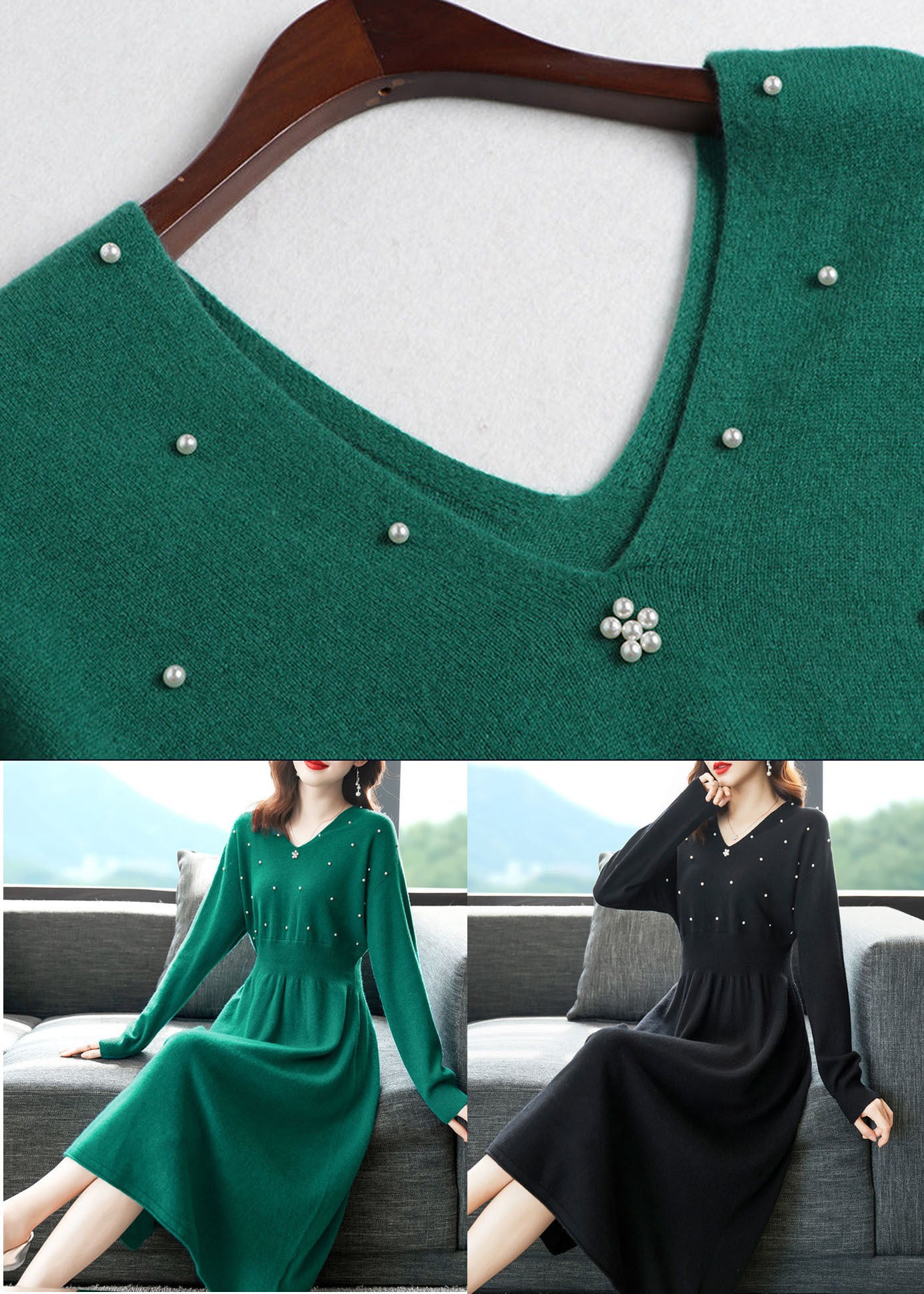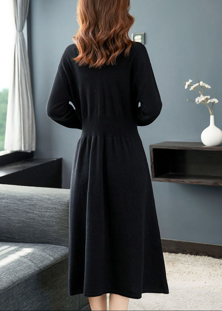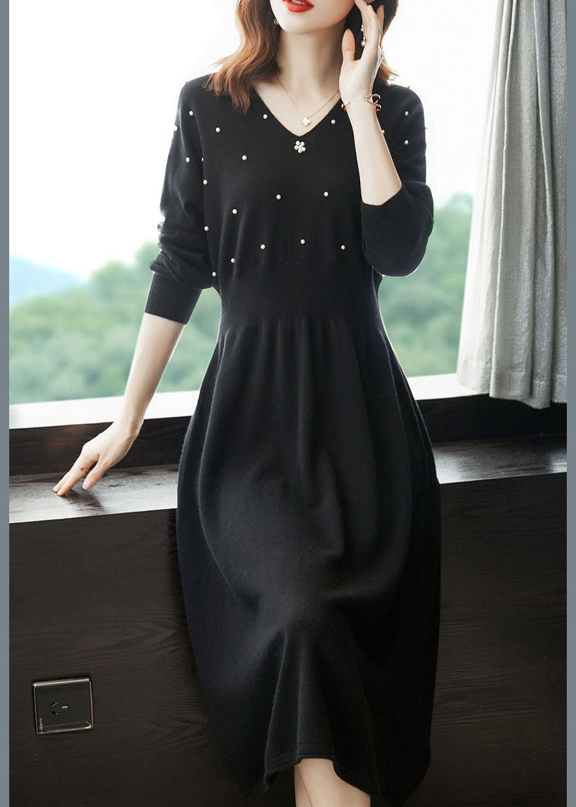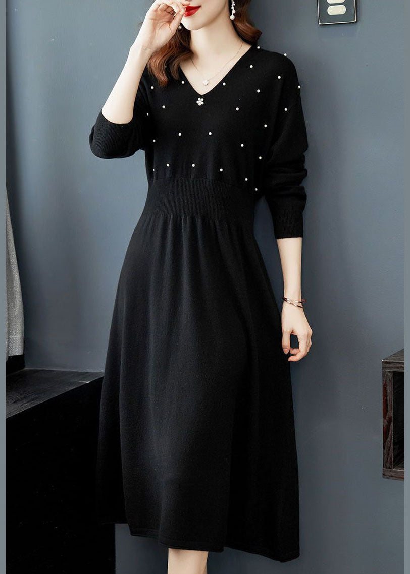 Black Knit Sweater Dress V Neck Nail Bead Exra Large Hem Winter