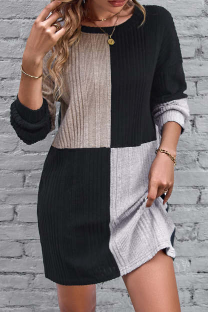 Vestido mini de manga larga con hombros caídos y bloque de color en costillas negras.