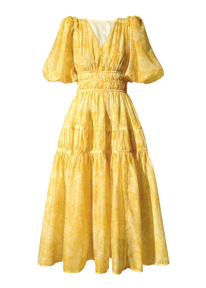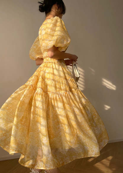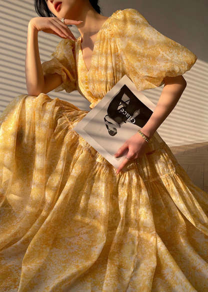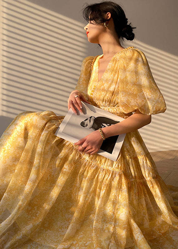 Bohemian V Neck Print Wrinkled Button Silk Maxi Dress Short Sleeve