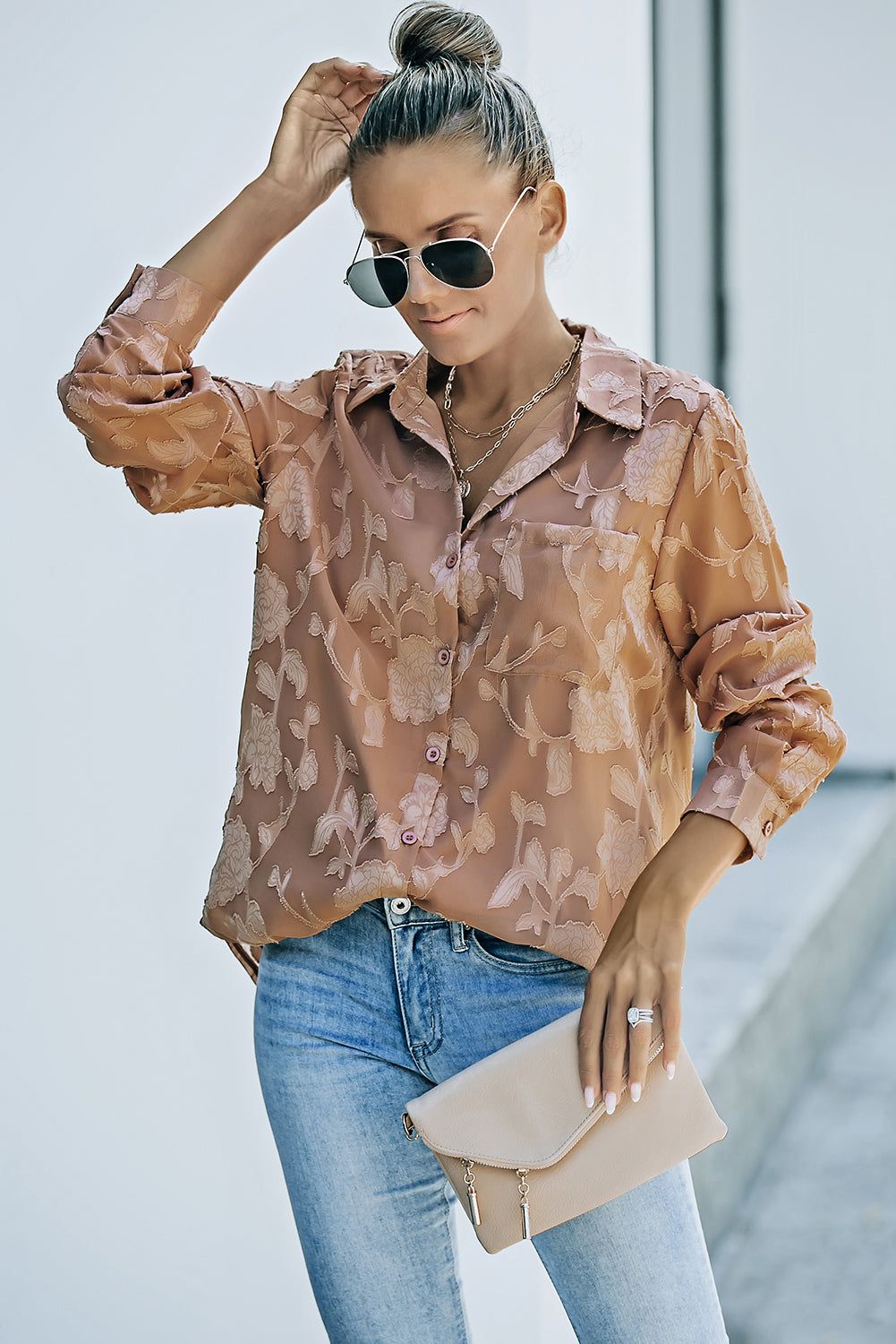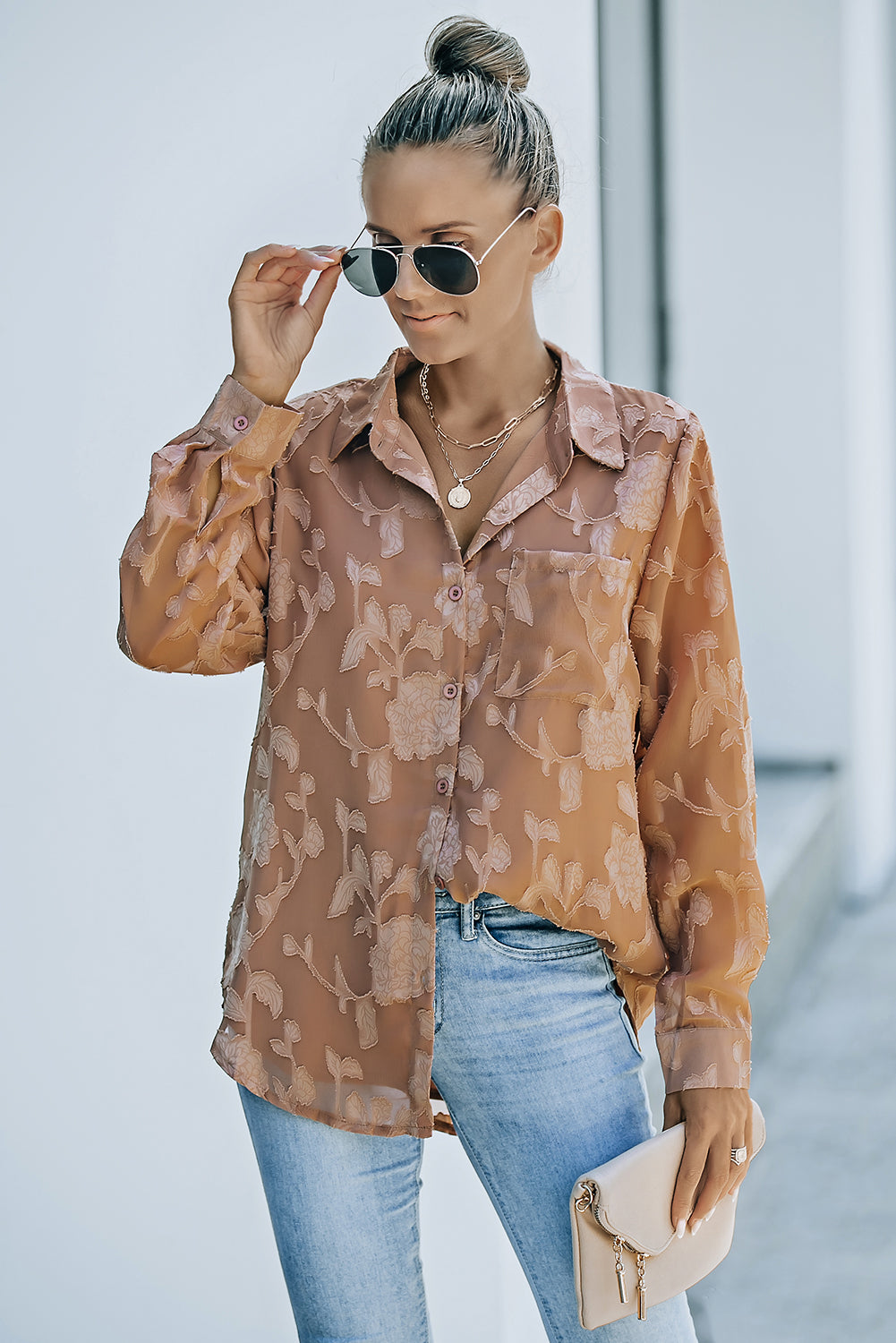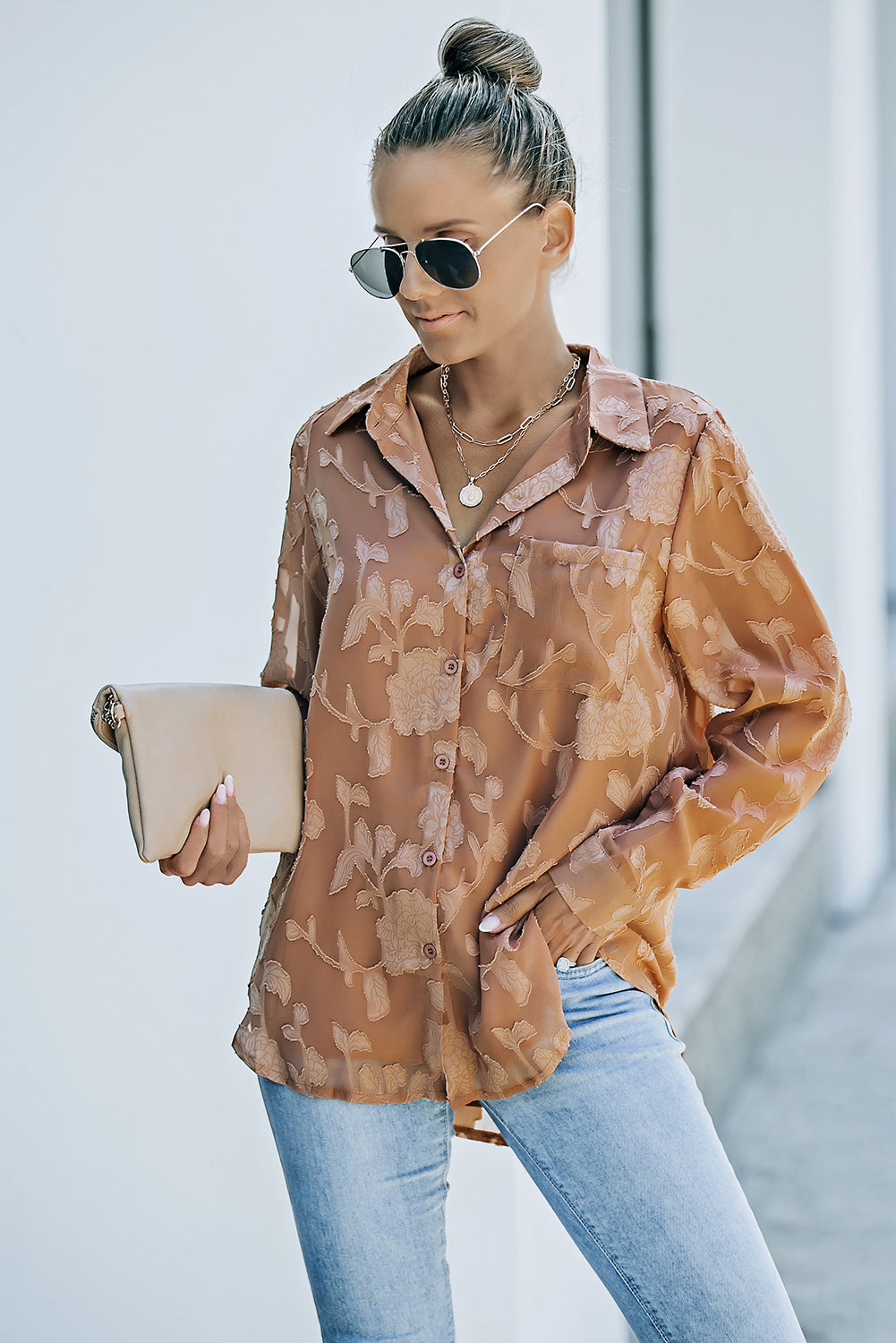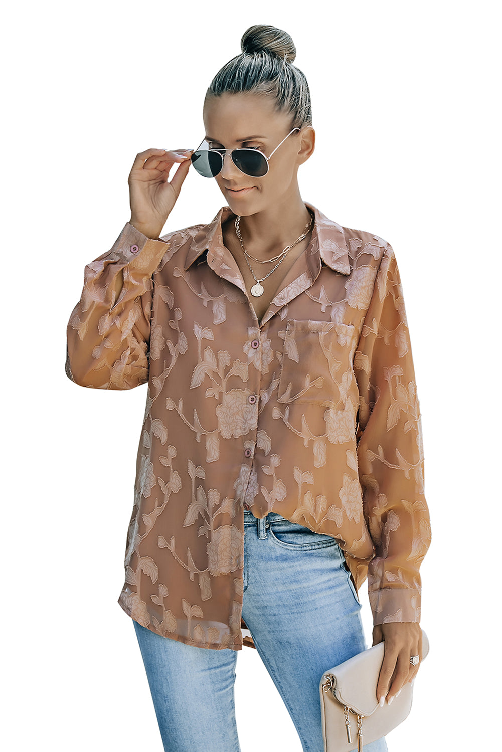 Camisa de flores con cuello marrón y textura