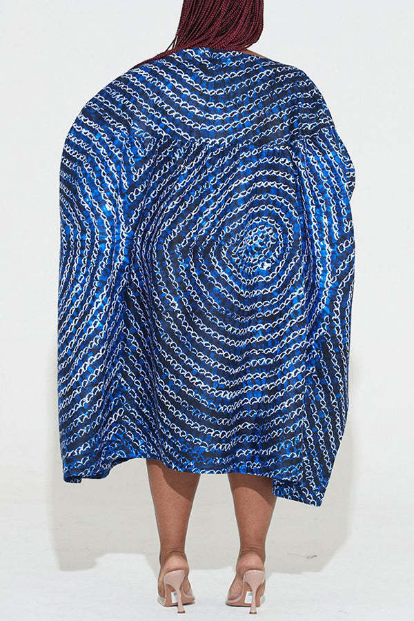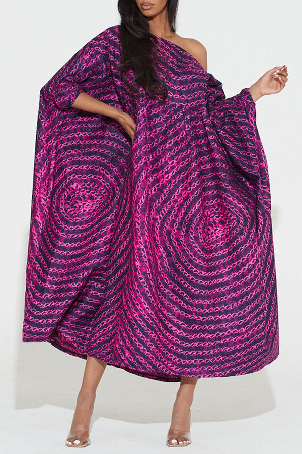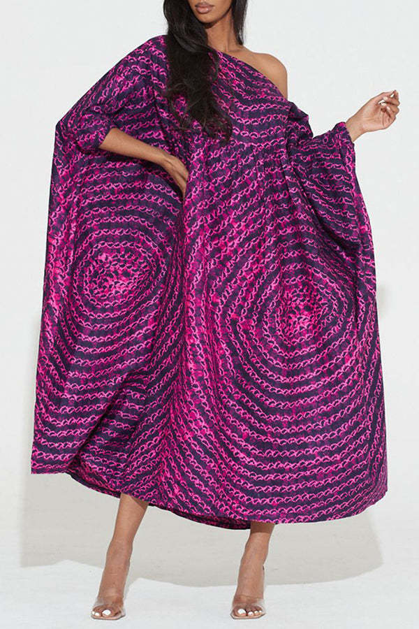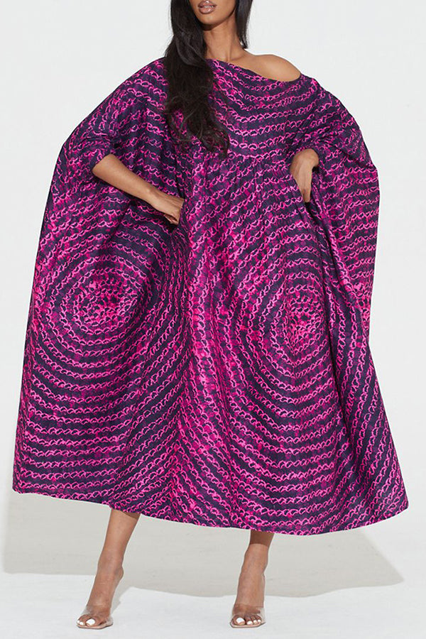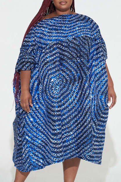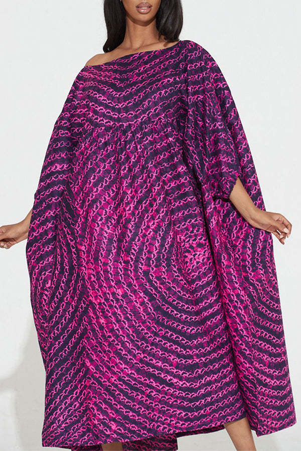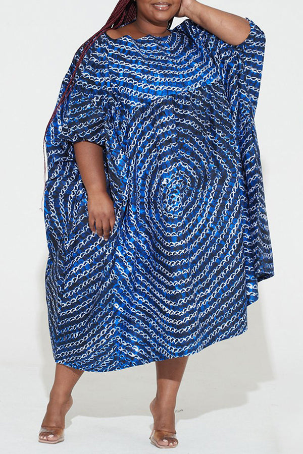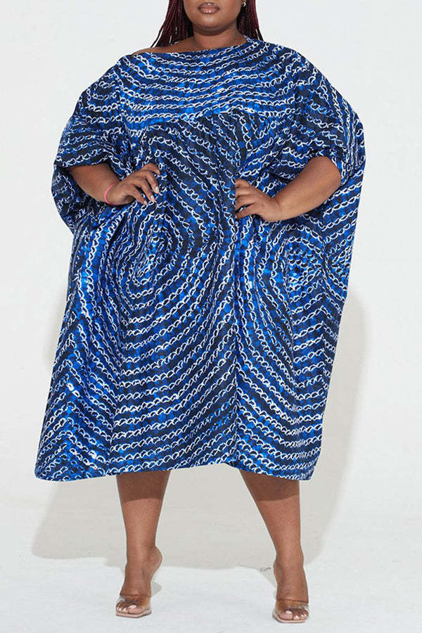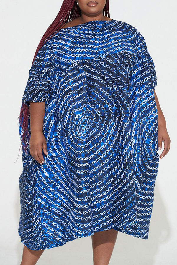 Chic Graphic Print Batwing Sleeve Slash Neck Plus Size Midi Dress