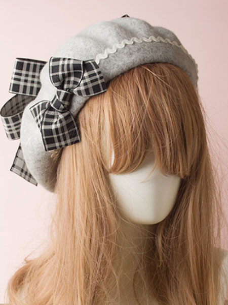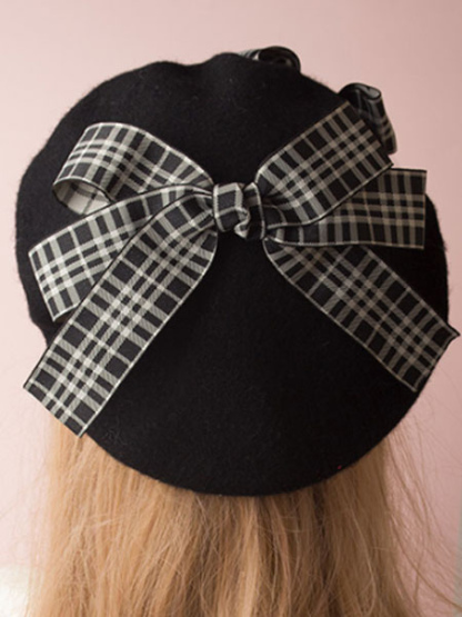 Classic Lolita Beret Plaid Bow Wool Burgundy Lolita Bowler Hat