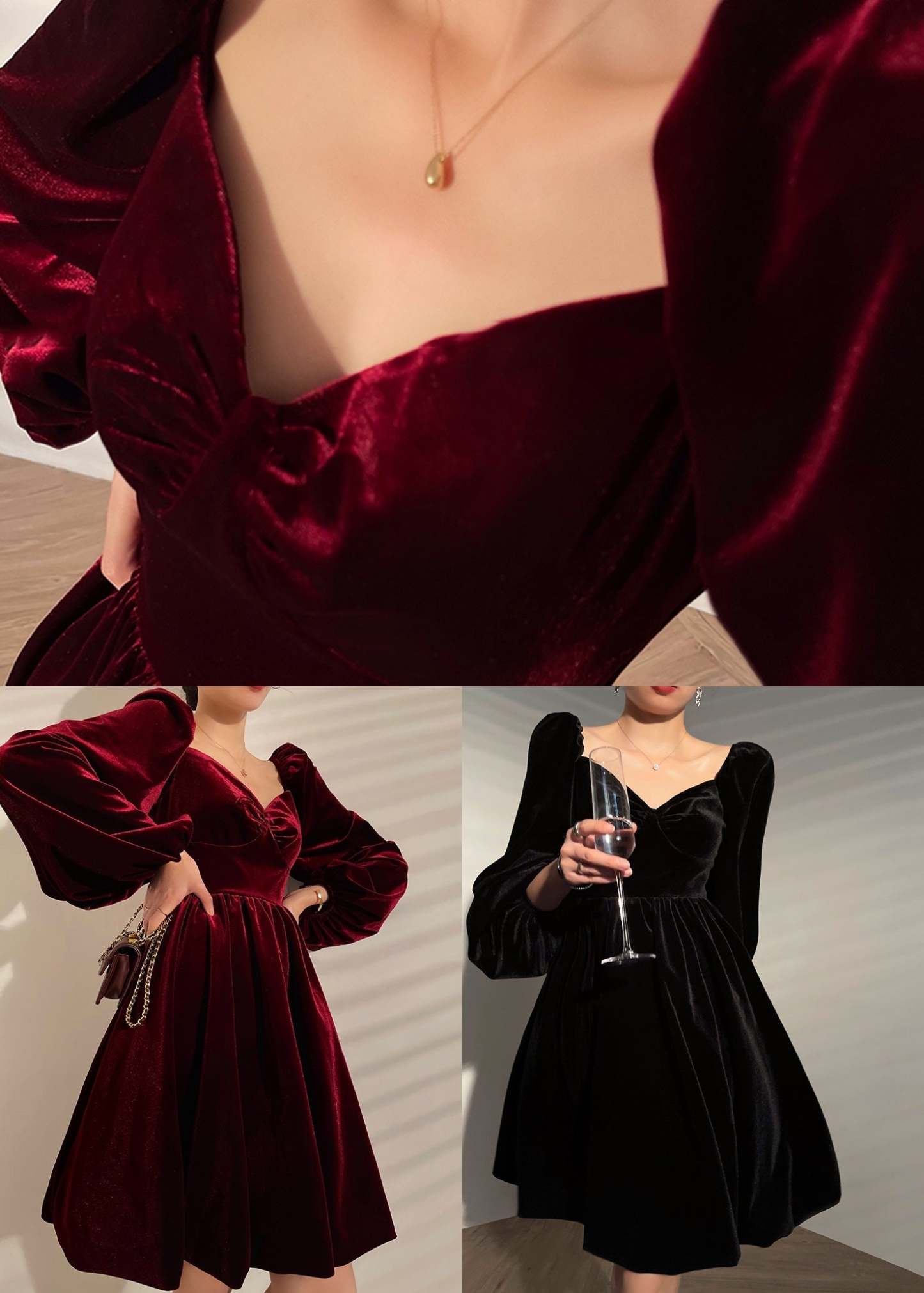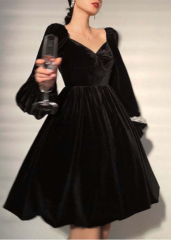 French Black V Neck Solid Color Velour Mid Dress Lantern Sleeve