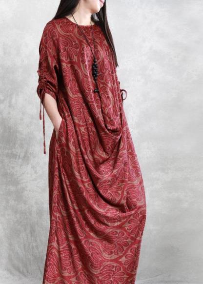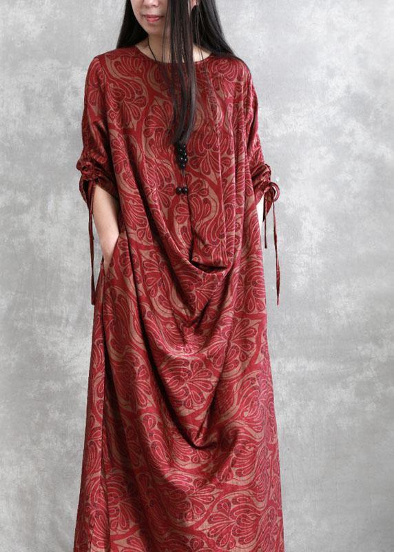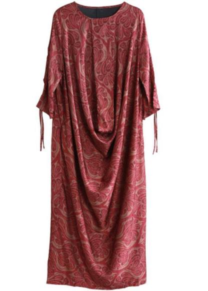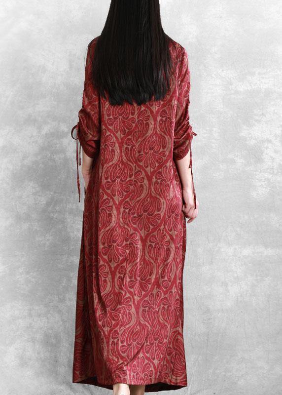 French Red Asymmetrical Design Button Fall Print Maxi Dresses Half Sleeve