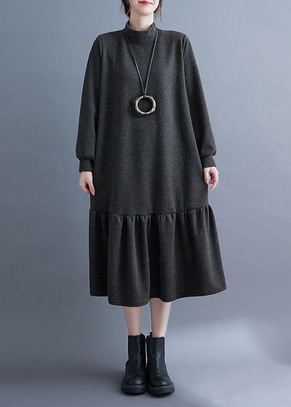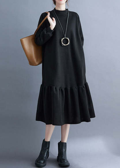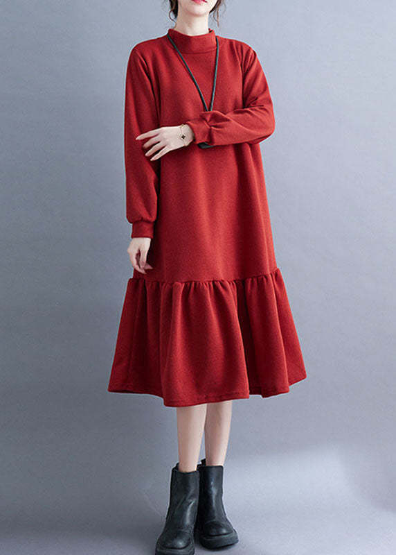French Red Turtleneck Ruffled Patchwork Thick Maxi Dresses Fall