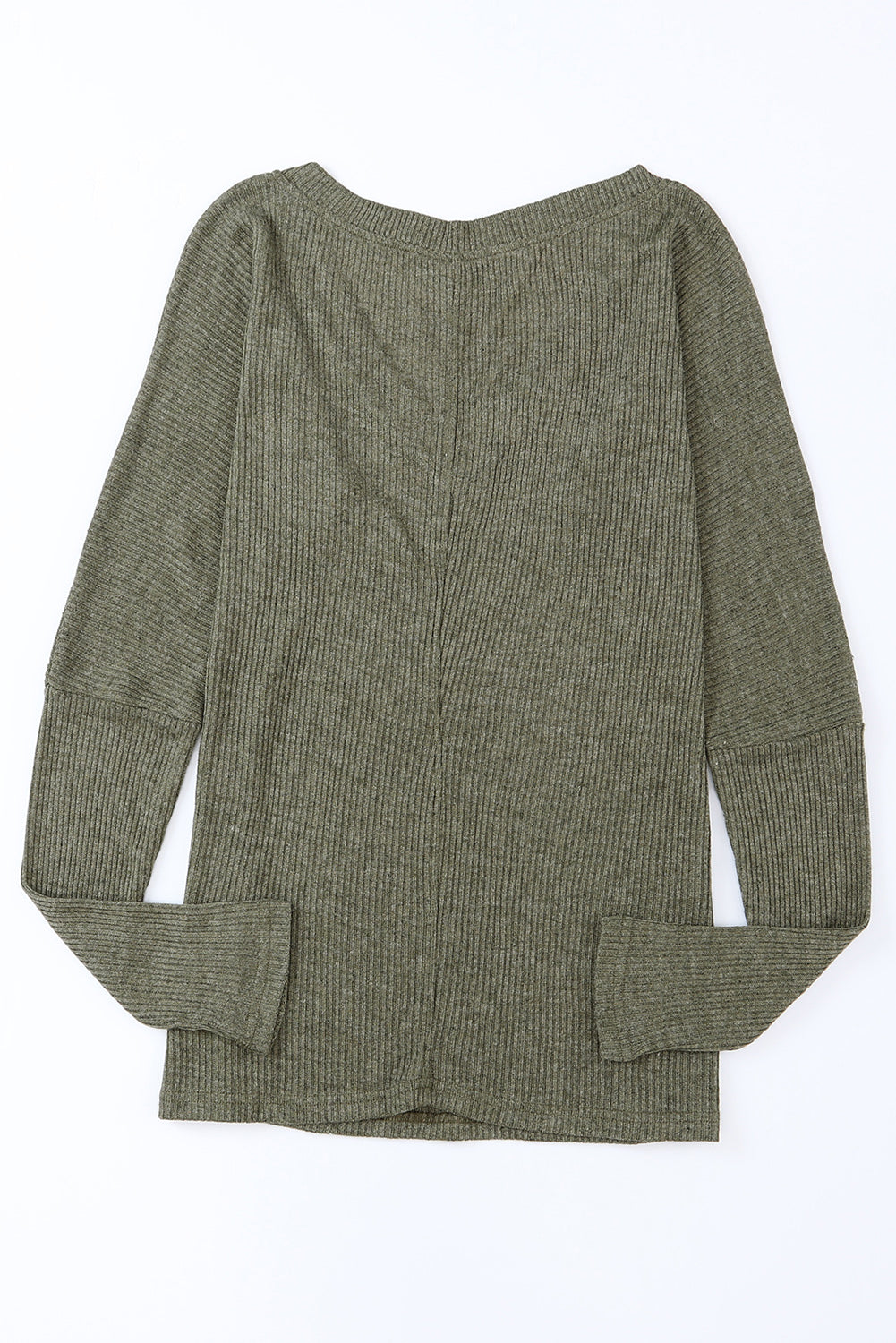 Top de manga larga de punto acanalado suelto con cuello en V verde