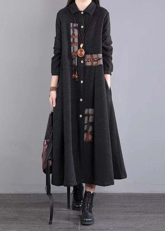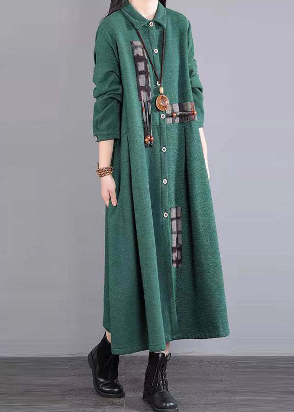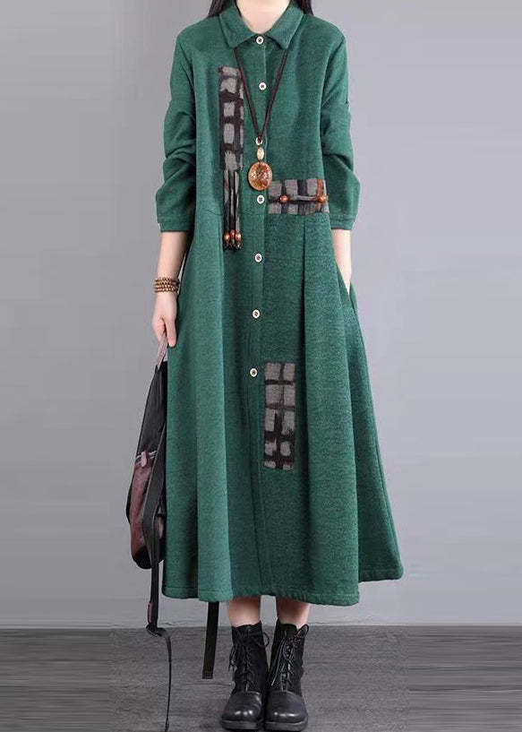 Green Pockets Patchwork Warm Fleece Maxi Dresses Peter Pan Collar Winter
