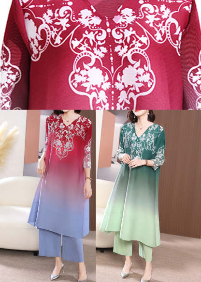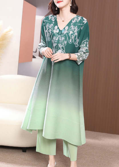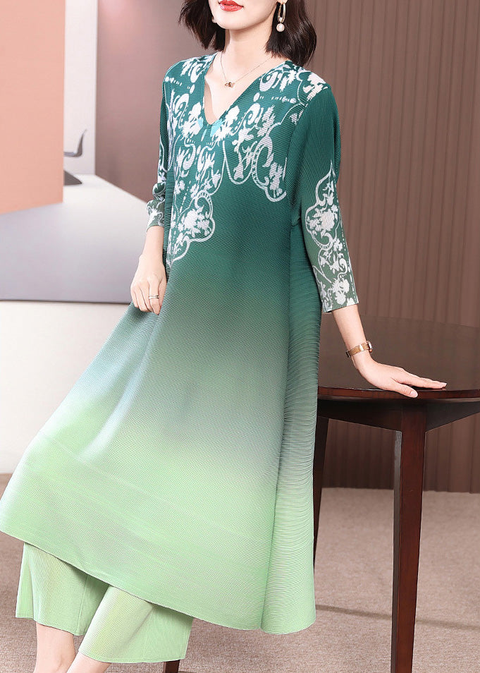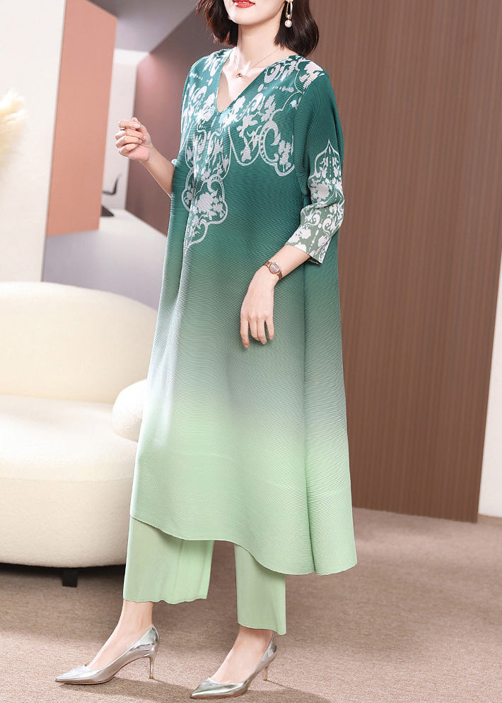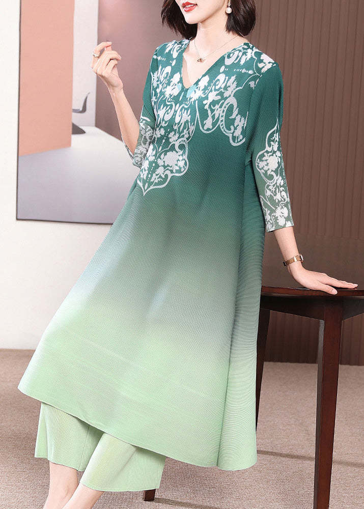 Green Side Open Long Dress And Wide Leg Pants Two Piece Set Half Sleeve