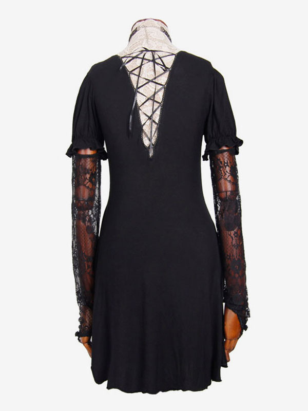 Halloween Gothic Lolita Punk Dresses Lace Up Lace Short Sleeves Black Dresses
