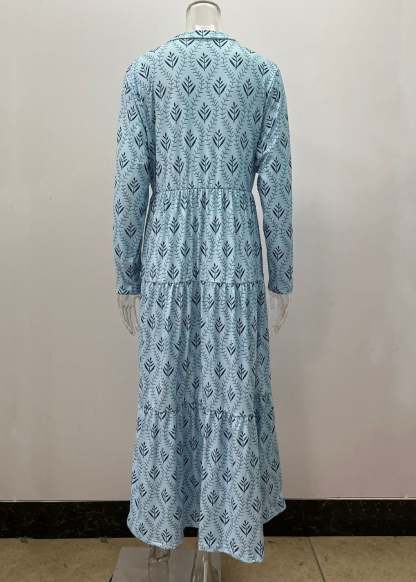 Loose Sky Blue V Neck Print Maxi Dresses Fall