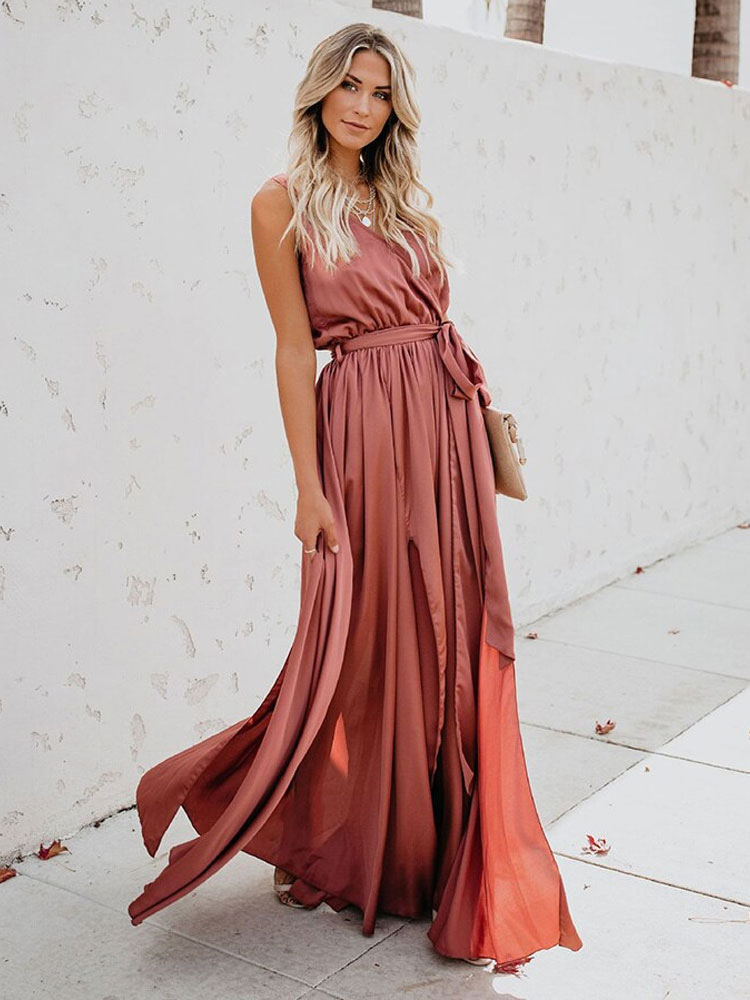 Vestido envolvente sin mangas rosa ruborizado con cuello en V, nudo y abertura en los vestidos maxi de graduación.