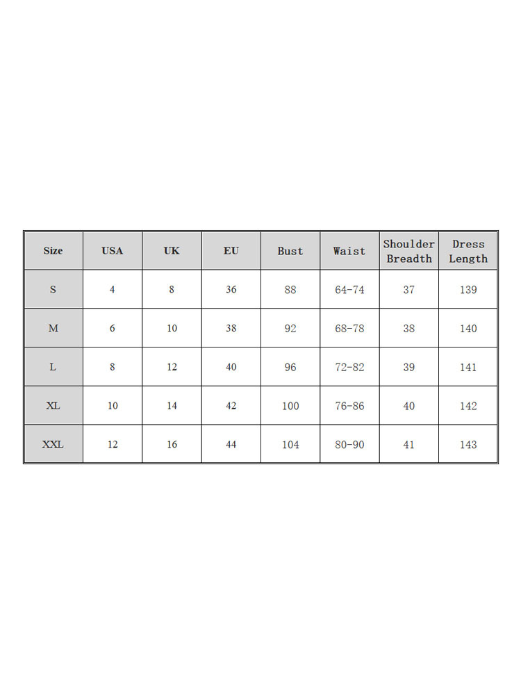 | S | Busto: 88 cm, Cintura: 64-74 cm, Ancho de hombros: 37 cm, Longitud del vestido: 139 cm |