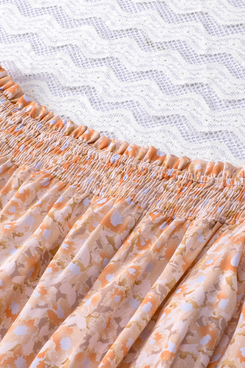 Top floral con hombros descubiertos con volantes y fruncidos en color naranja.