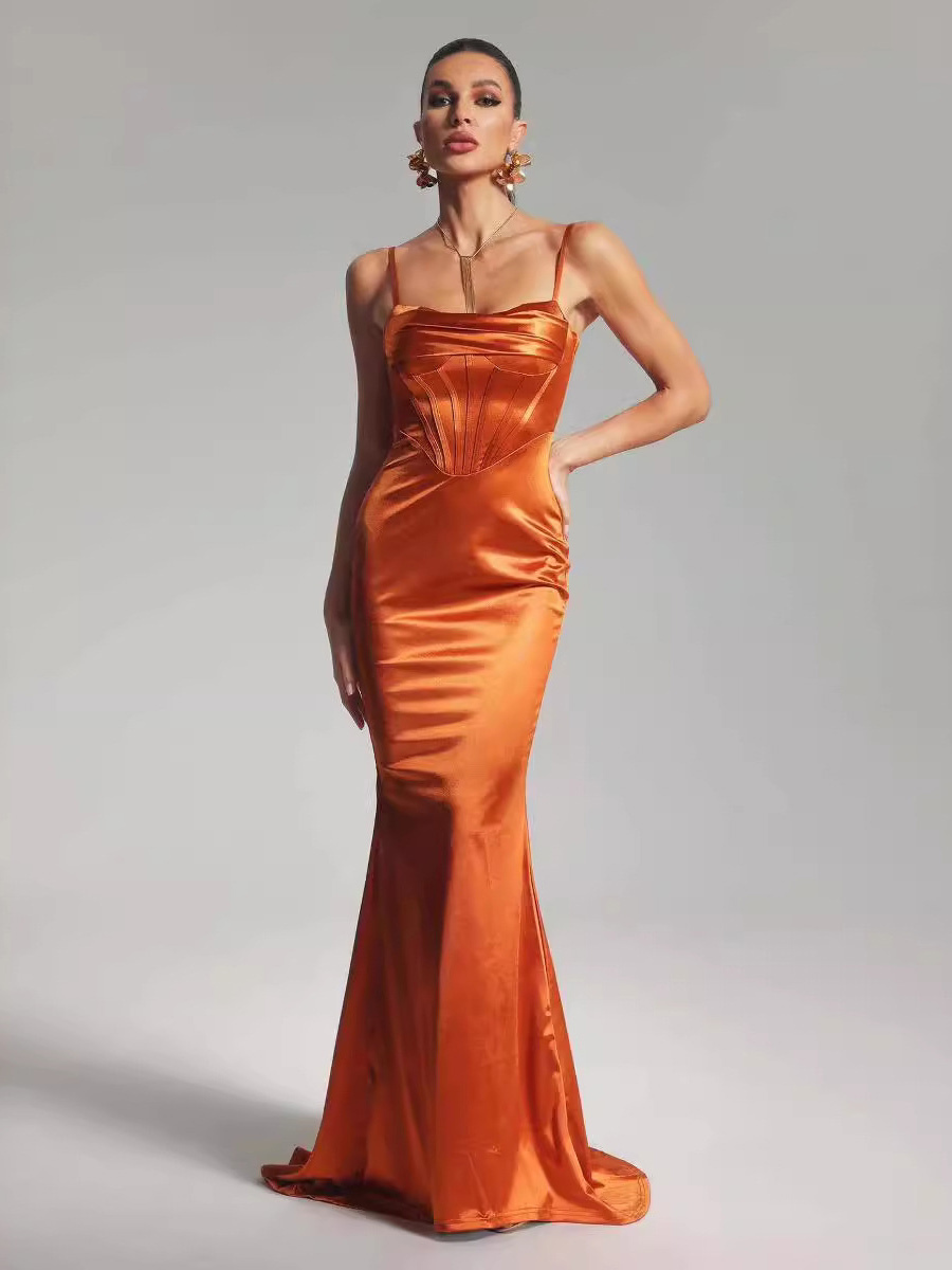 Party Dress Orange Strap Shoulder Backless Fit And Flared Prom Maxi Dress