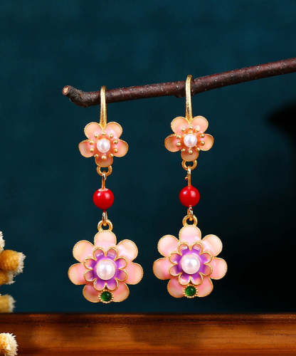Retro Rainbow Copper Overgild Acrylic Pearl Camellia Drop Earrings