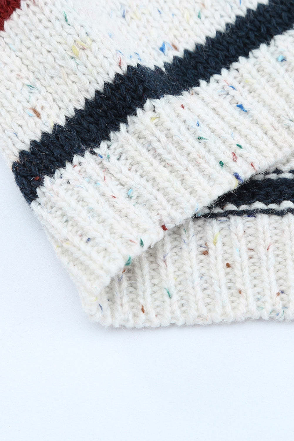 Suéter gris brezo con un patrón de rayas coloridas