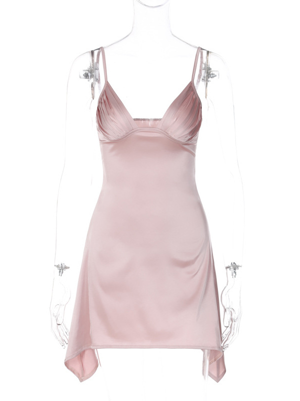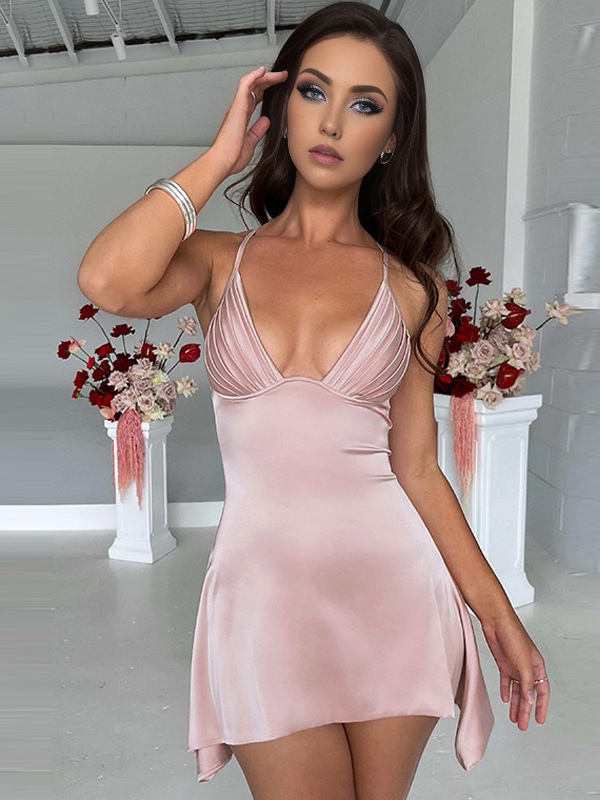Vestido de verano con escote en V, plisado, sin espalda, de color rosa y longitud mini para la playa.