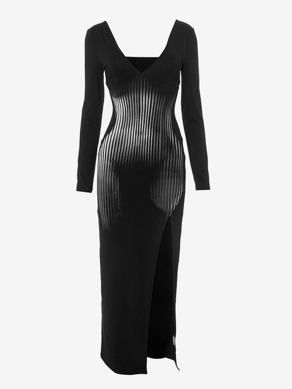 Vertical Stripe Slit Dress V-neck Long Sleeve Bodycon Maxi Dress For Women 2025