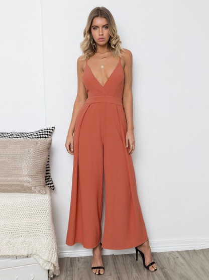 Women Watermelon Red Straps V-Neck Sleeveless Pleated Irregular Spaghetti Straps Jumpsuits For Women