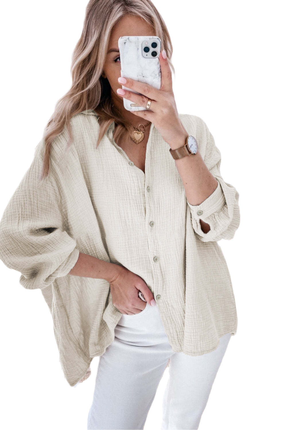 - It features bracelet sleeves, button-up closure, and a loose fit