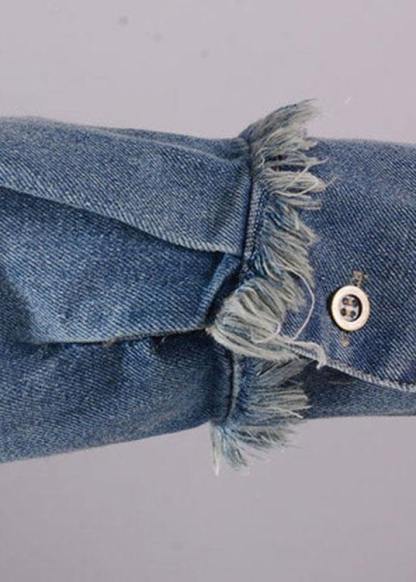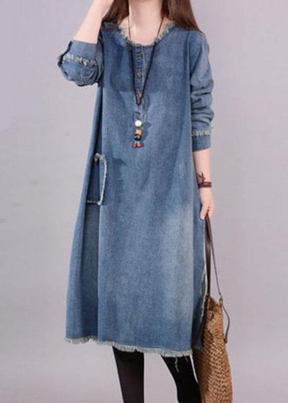 Art Blue O-Neck Pockets Button Denim Fall Long sleeve Dress