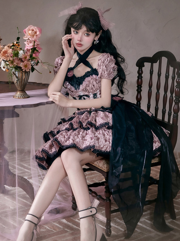 Back to school Gothic Lolita Dresses Ruffles Bows Floral Print Pink Pink