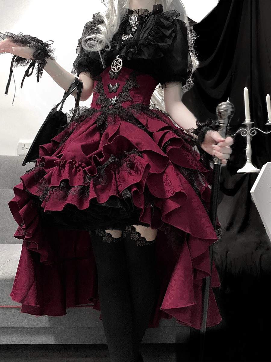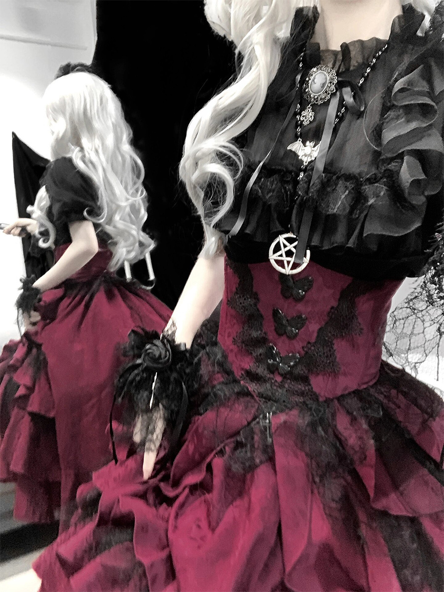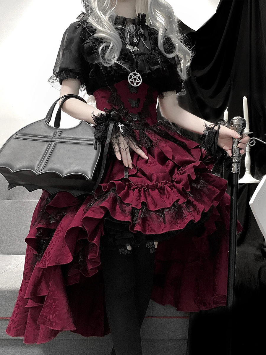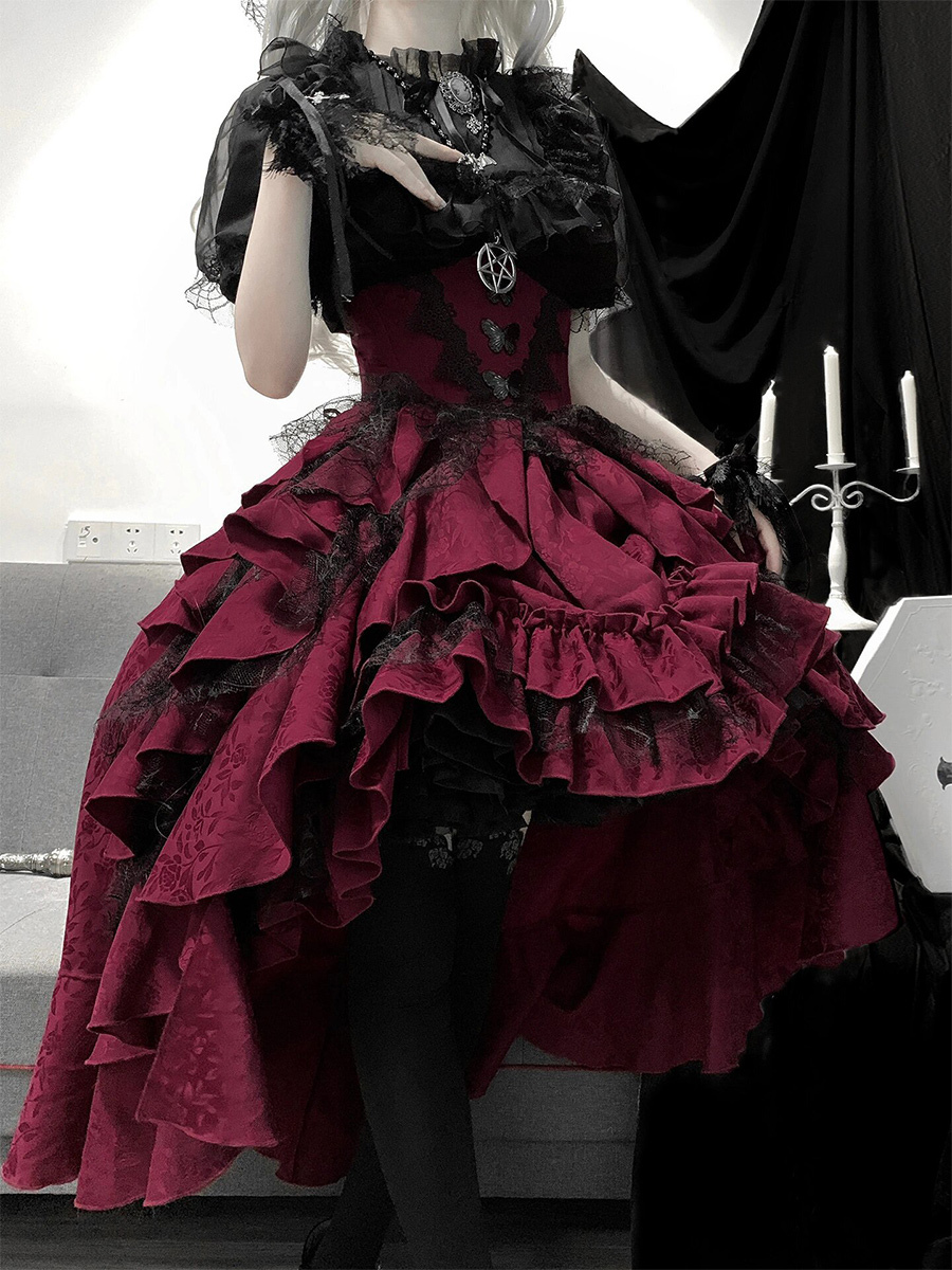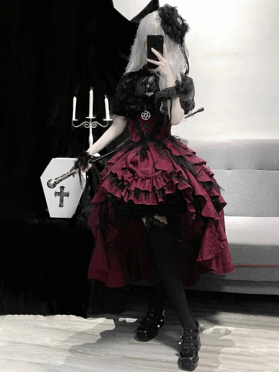 Gothic Lolita Tow-piece suit Mesh Lace shirt and High Low Ruffles Skirts Dark series Cosplay costumes