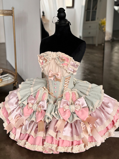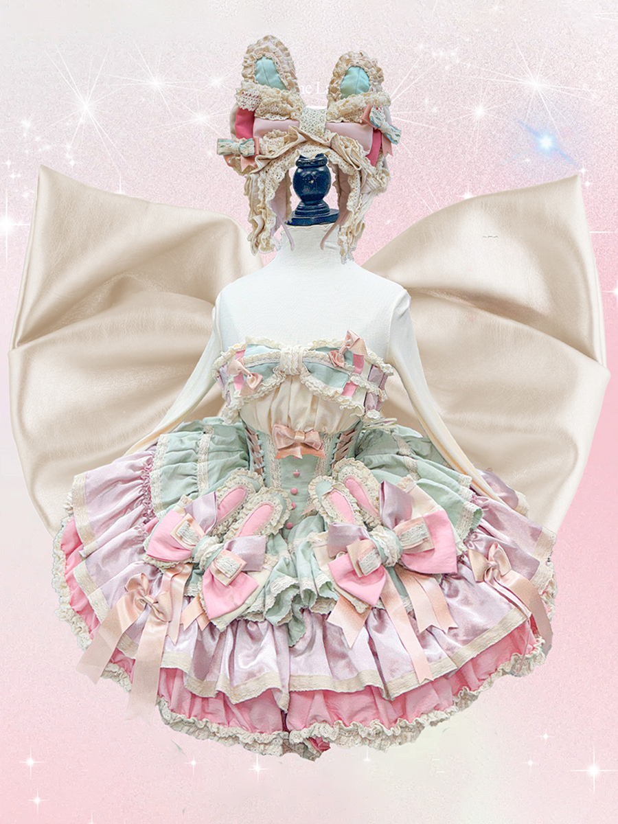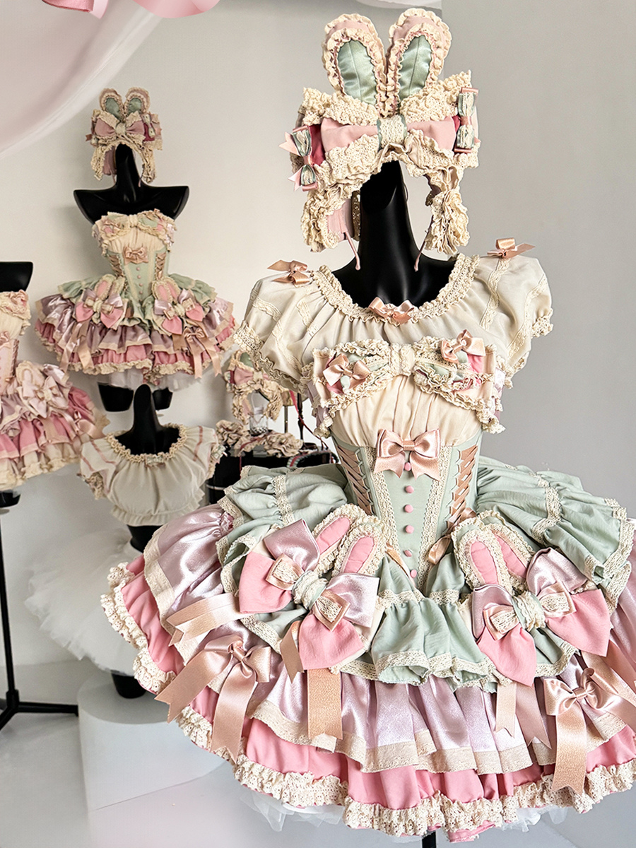 Back to school Sweet Lolita Dress Ribbon Bow Ballet Style Bunny Ears Cake Dress Pink-green Ruffles Short Dress