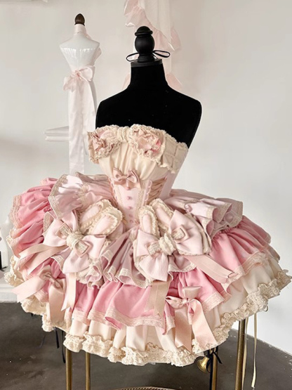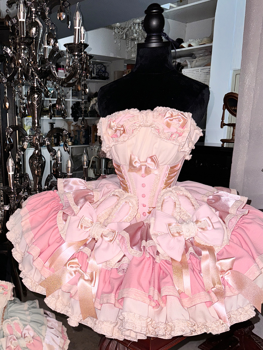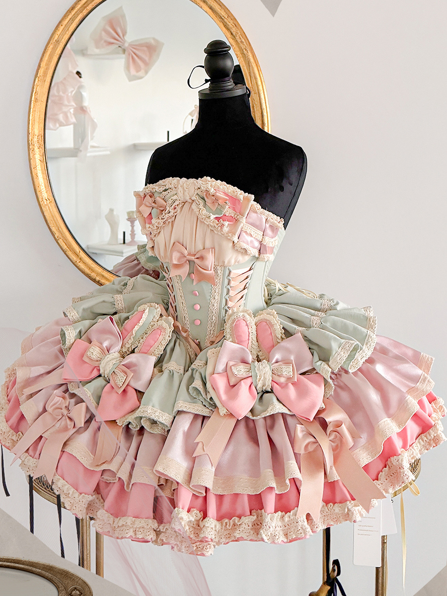 This dress features a cake skirt with layers of ruffles, a metallic ribbon bow and a variety of laces, and a fishbone cinched waist at the waist.