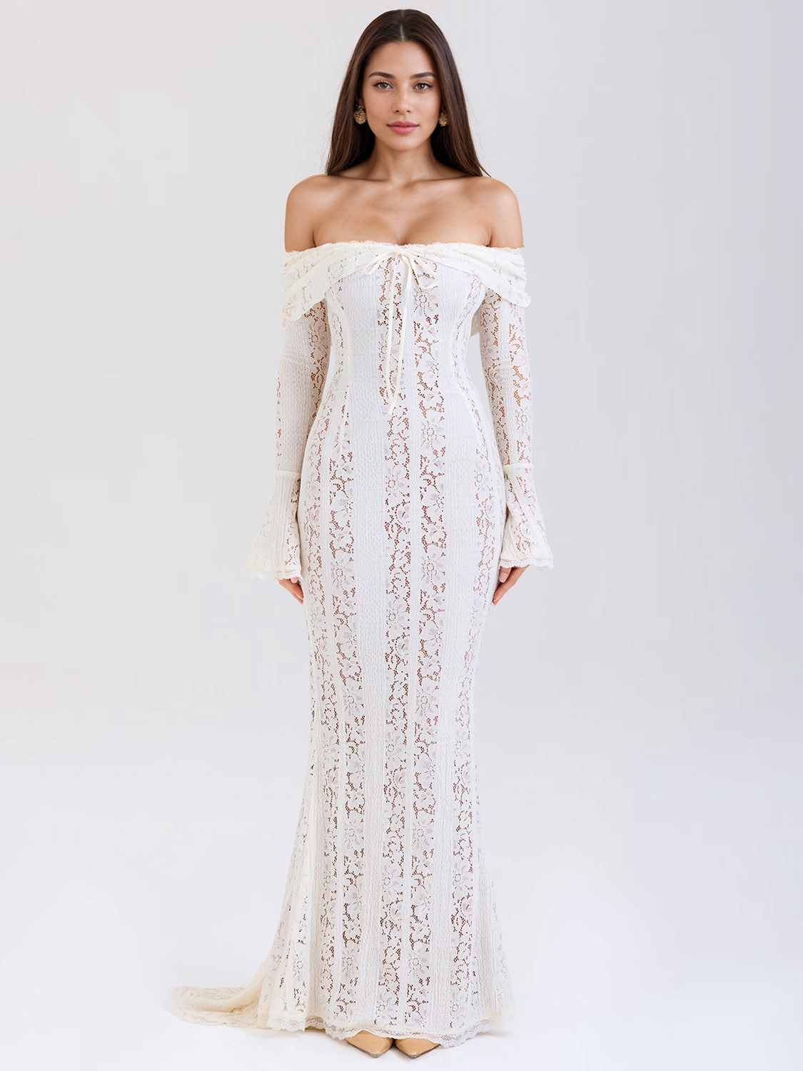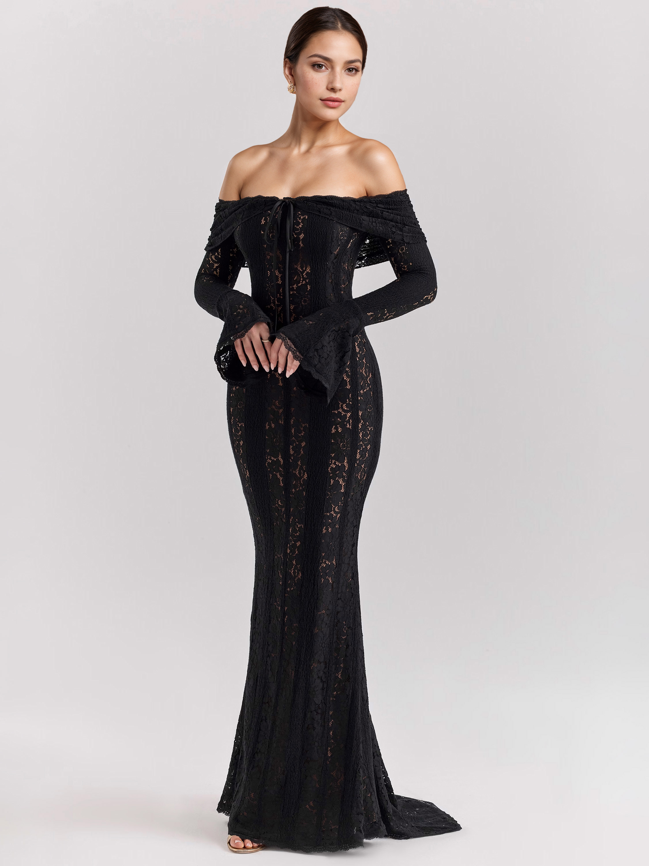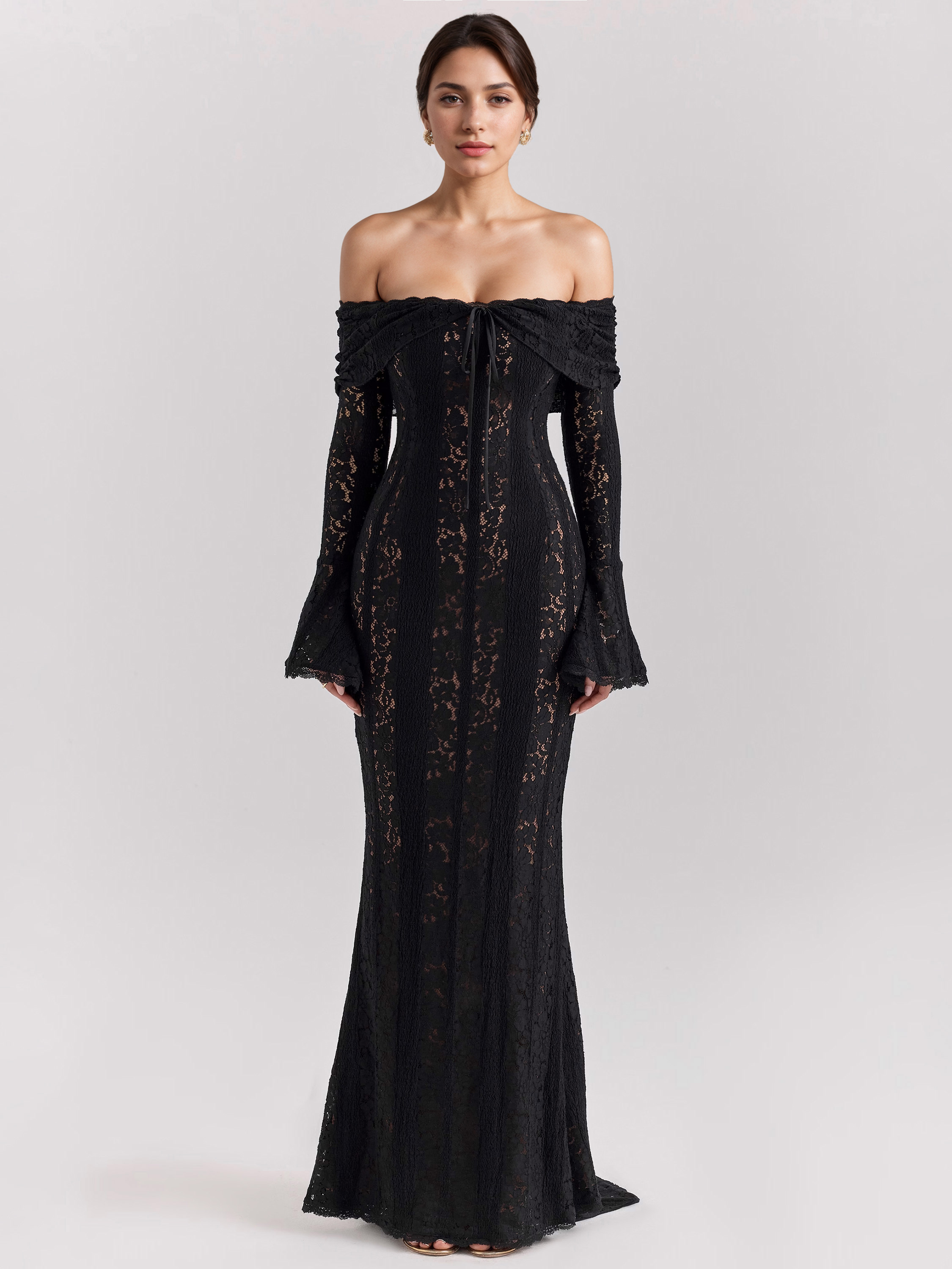 Black Floral Lace Maxi Dress Off Shoulder Bell Long Sleeve Mermaid Bodycon Dress For Women 2025