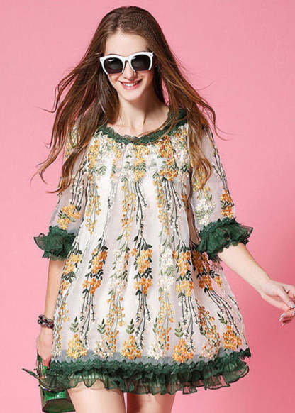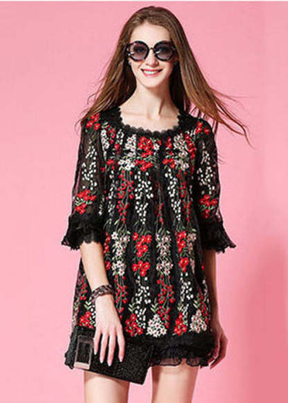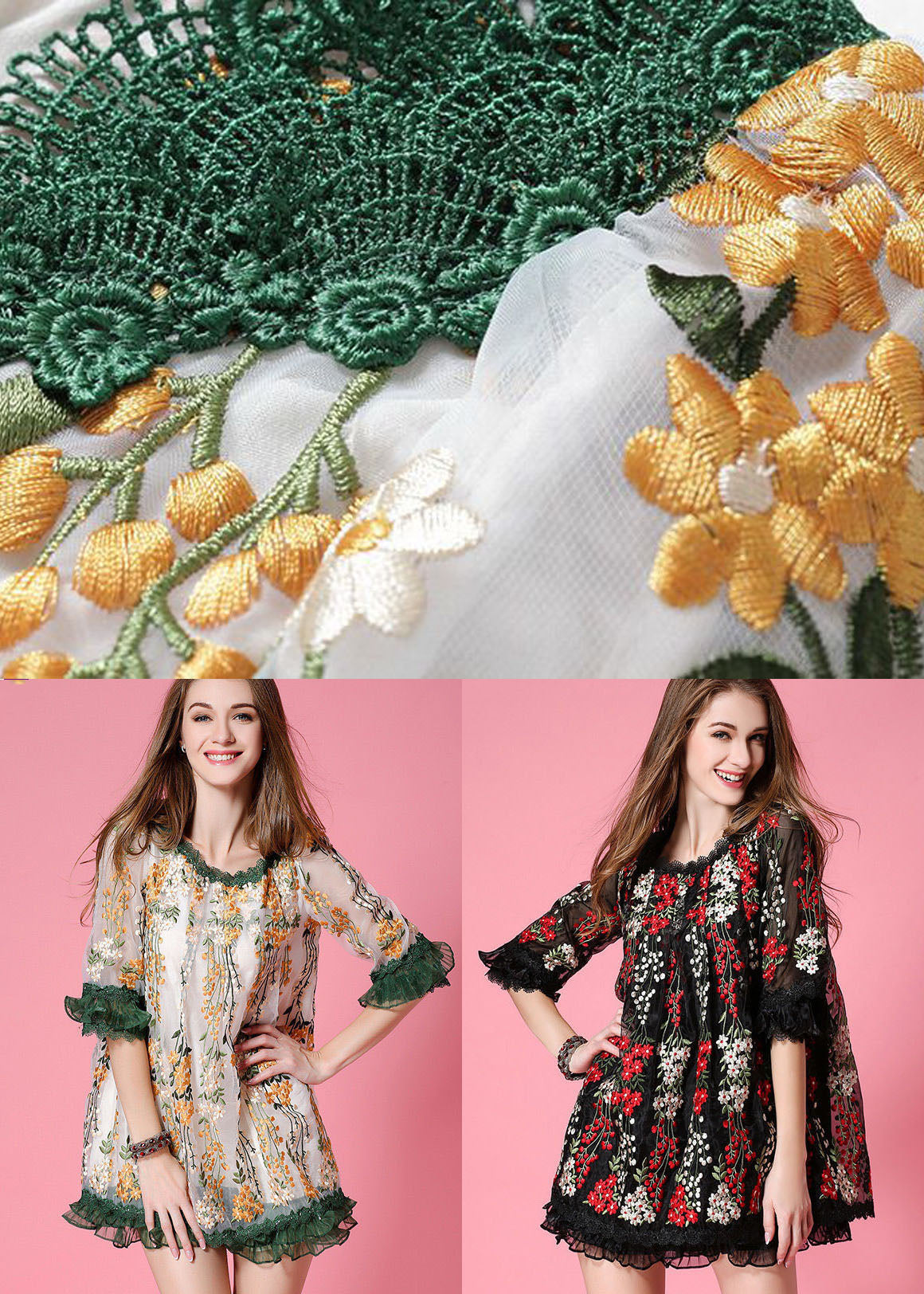 Black Organza Mini Dresses Embroideried Ruffled Spring