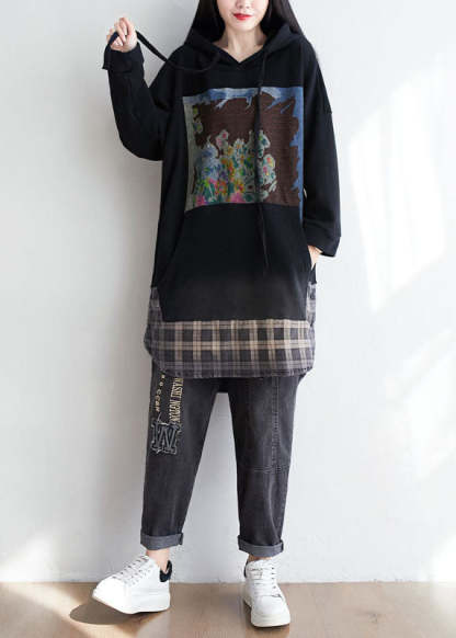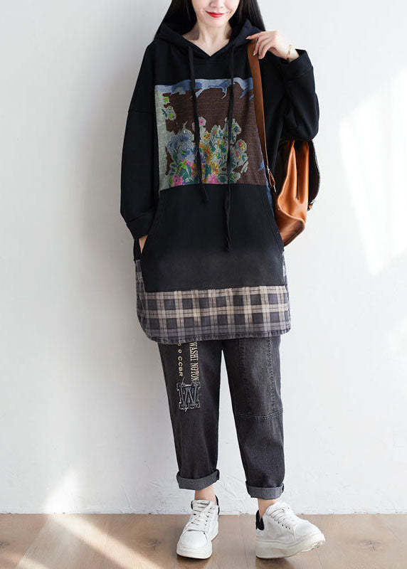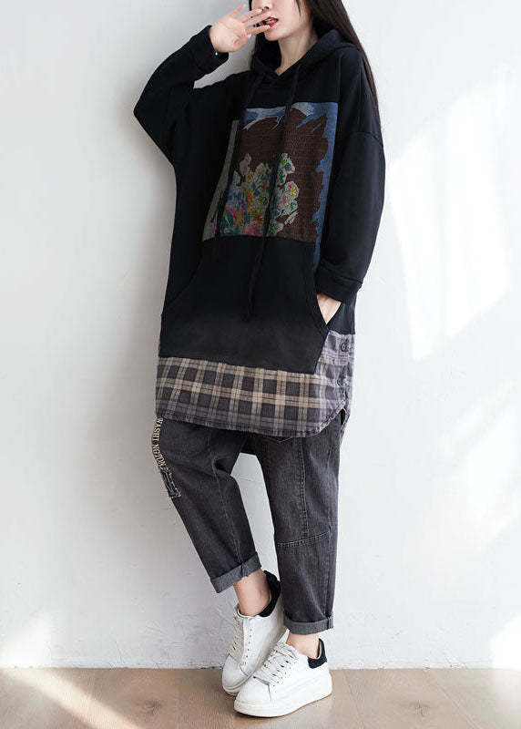 Black Patchwork Cotton Pullover Sweatshirt Dress Oversized Print Spring