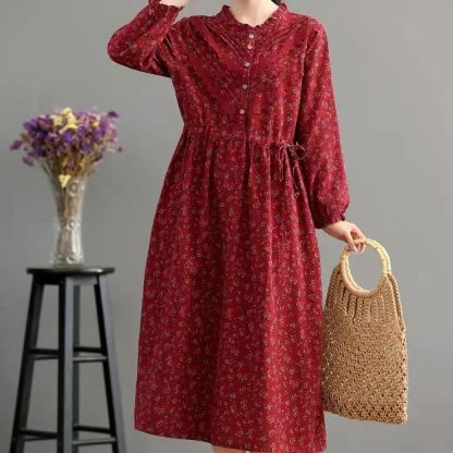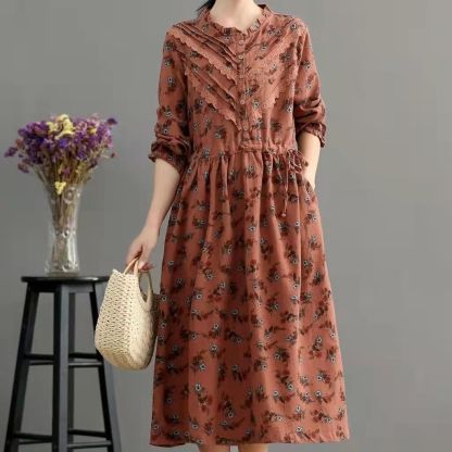 Bohemian Blue Pockets Print Loose Fall Maxi Dress Long sleeve