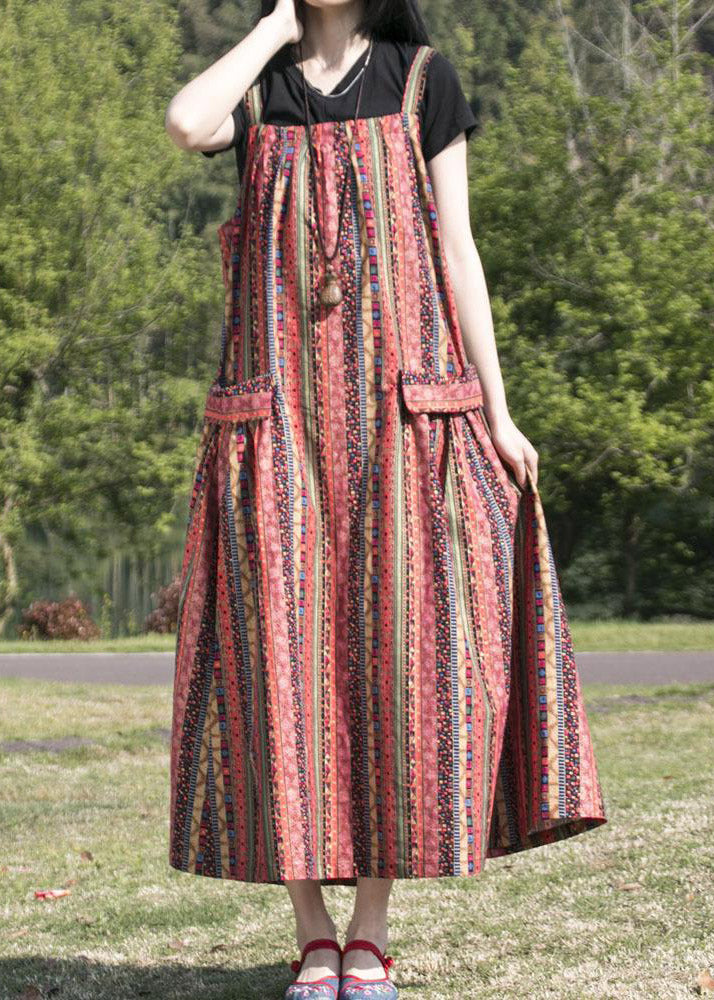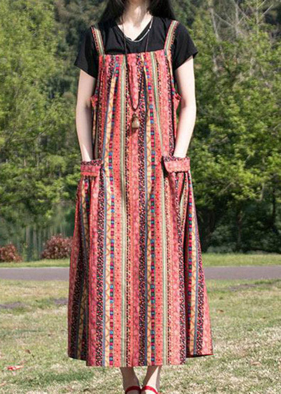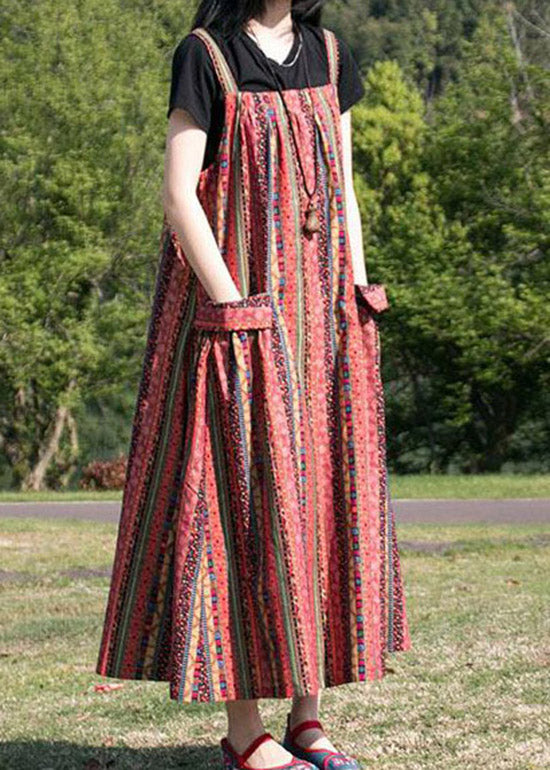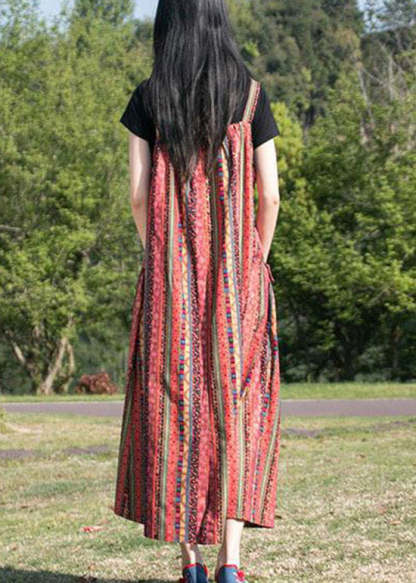 Bohemian Red Striped Patchwork Cotton Spaghetti Strap Dress Fall