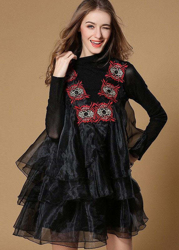 Boutique Black Turtle Neck Embroideried Ruffles Patchwork Organza Mini Dress Spring
