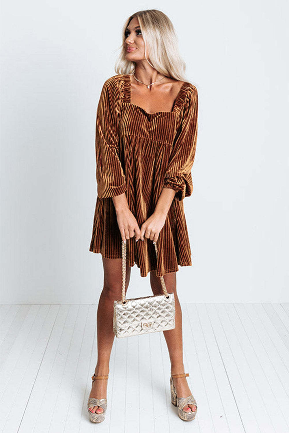 Brown Tie Back Square Neck Velvet Babydoll Dress