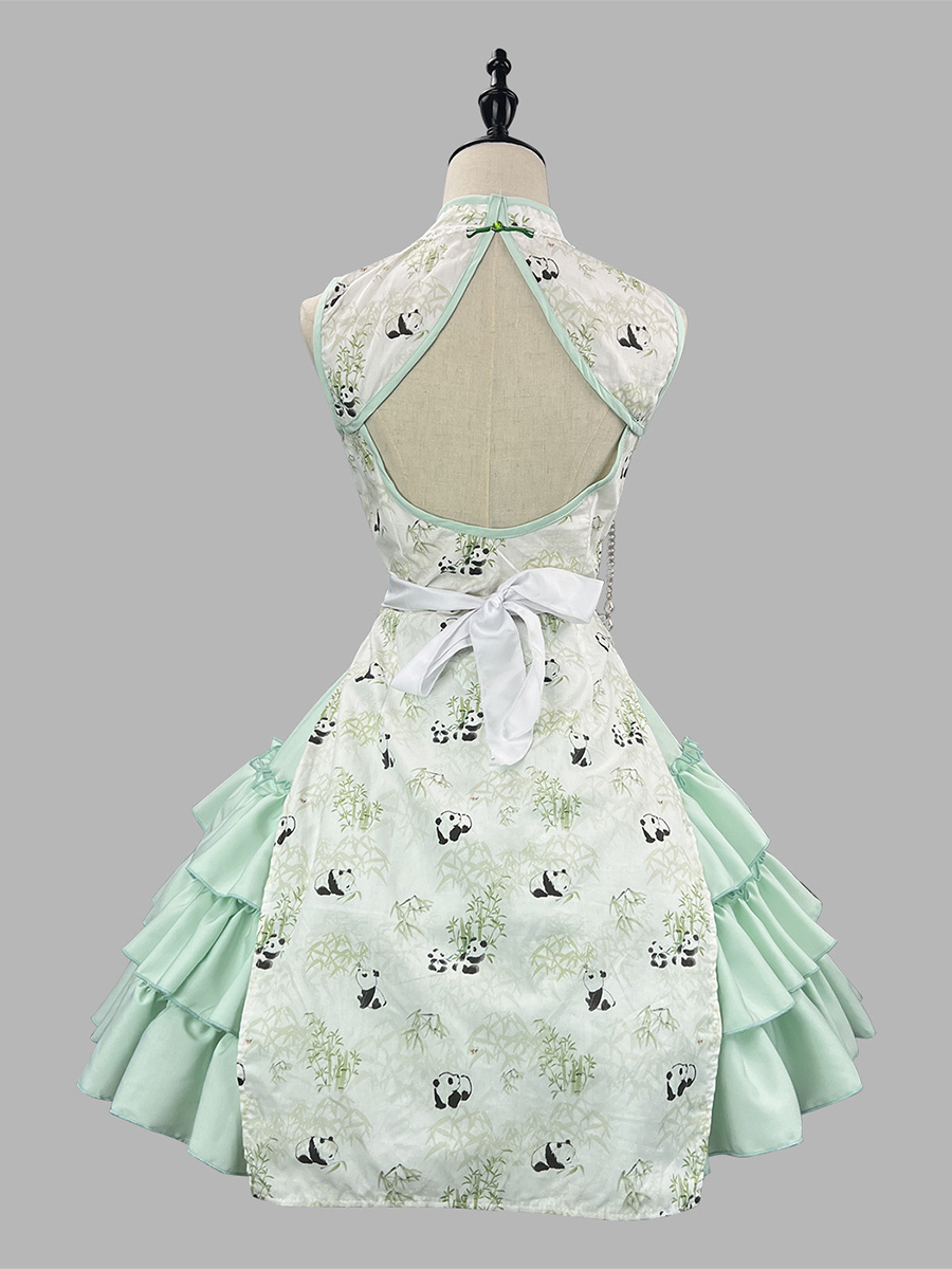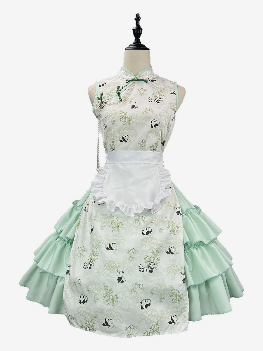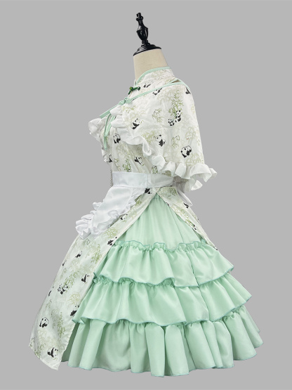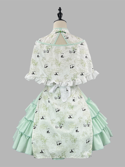 Chinese Style Lolita Outfits Green Ruffles Panda Sleeveless Skirt Cloak Apron Sets