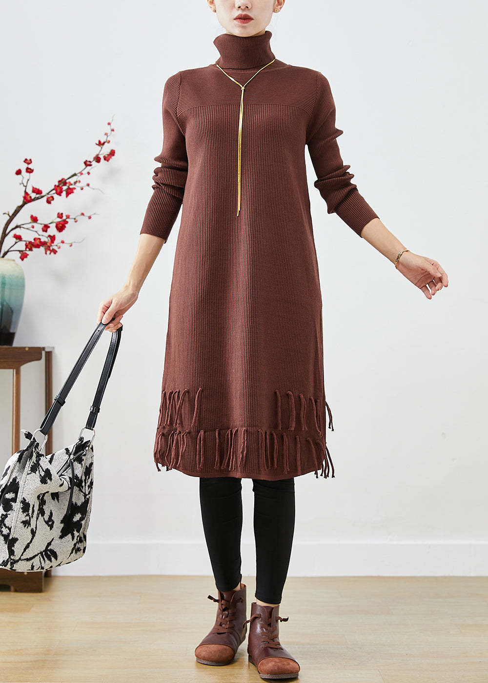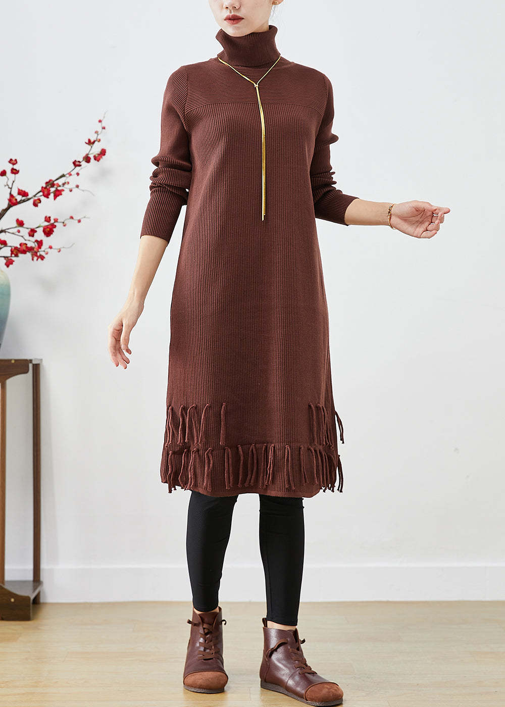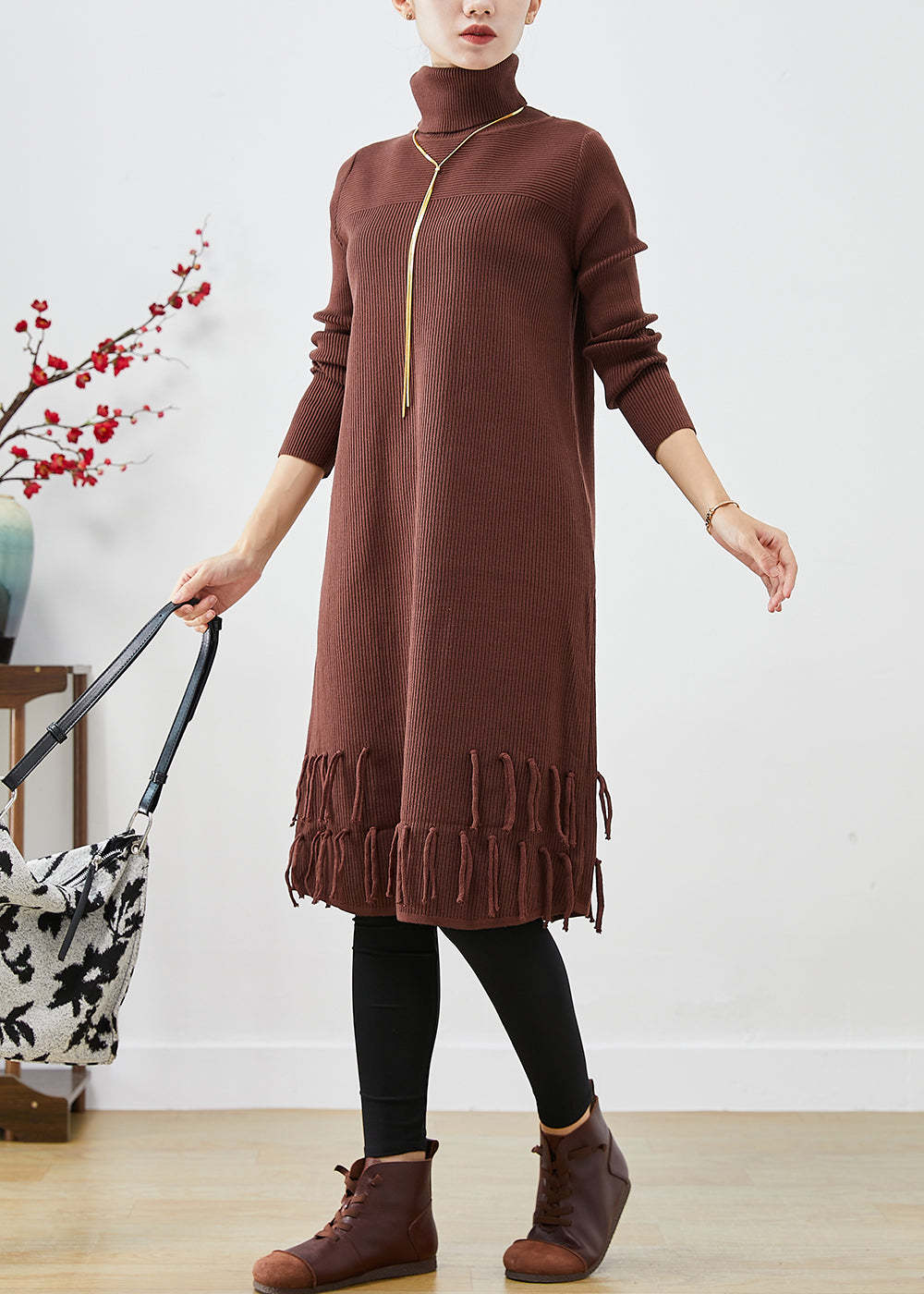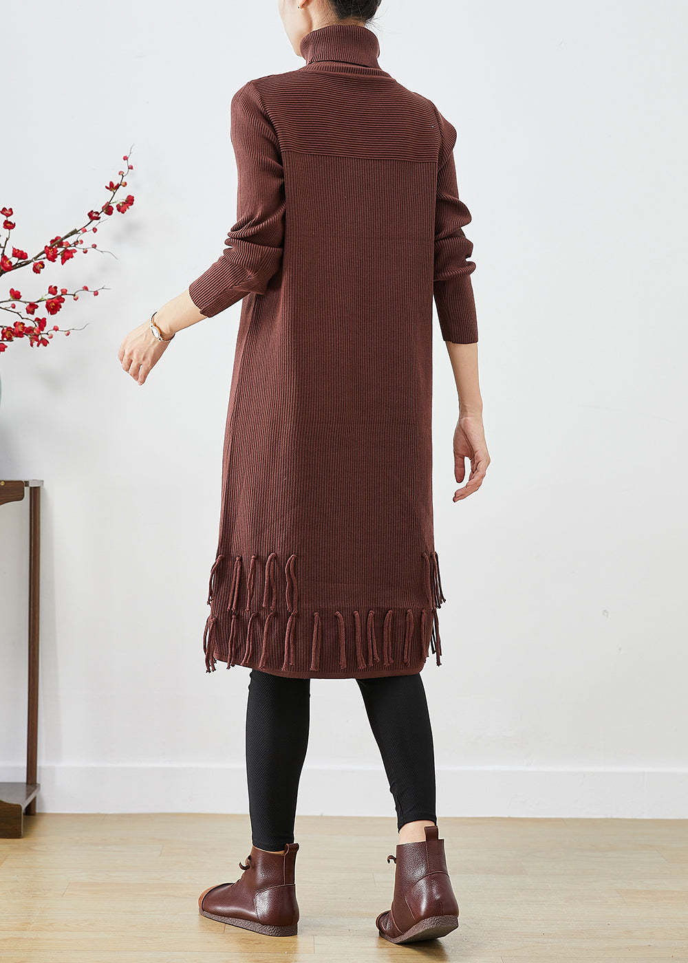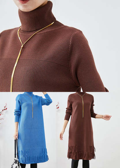 Chocolate Knit Sweater Dress High Neck Tasseled Fall