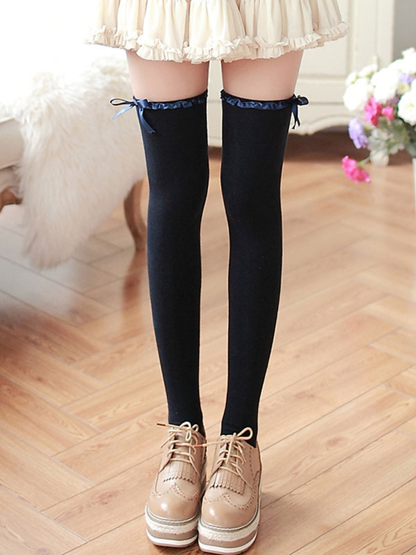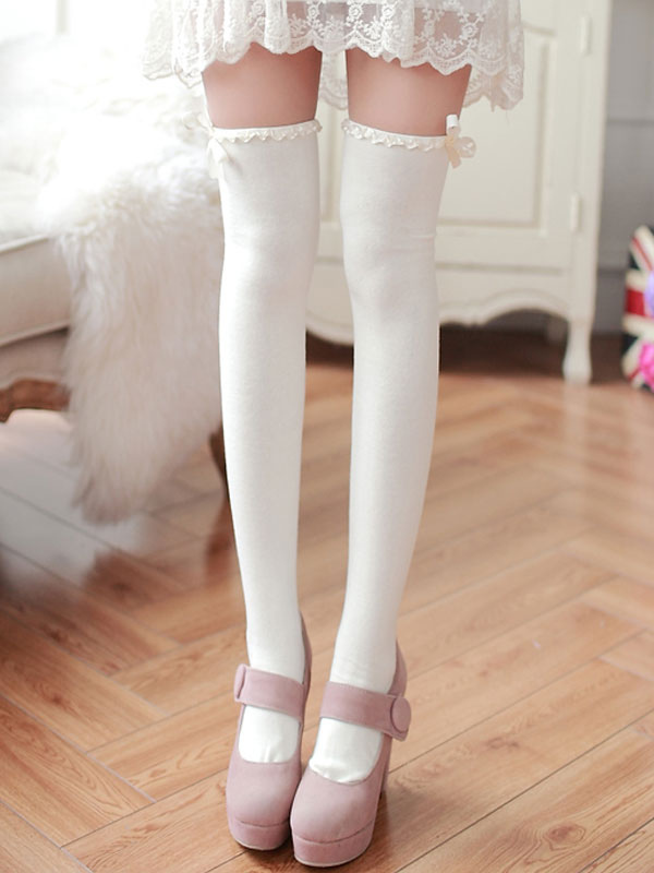 Classic Lolita Stockings White Bows Ribbons Printed Lolita Knee High Socks