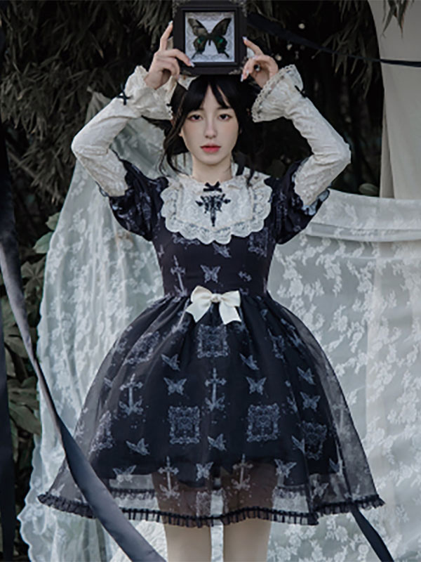 Classical Lolita Dress Polyester Short Sleeves butterfly Pattern Lolita Dresses Gothic Black