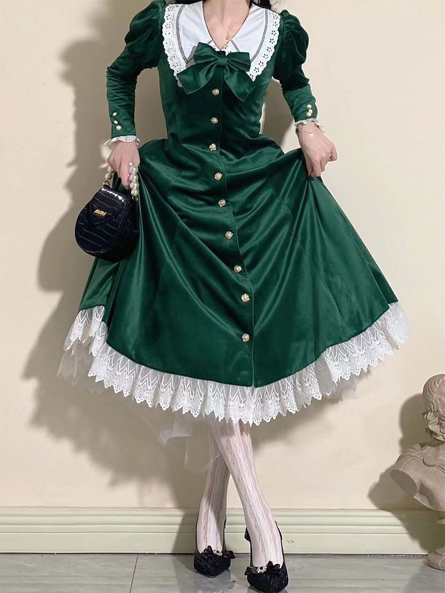 Classical Lolita Dress Velour Short Sleeves Color Block Lolita Dresses Classic Deep Blue